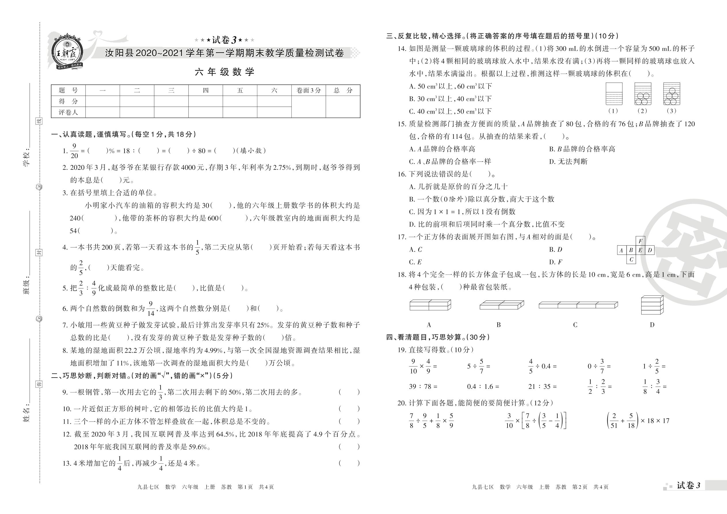 汝阳县2020~2021学年第一学期期末教学质量检测试卷六年级数学(苏教版)【3】