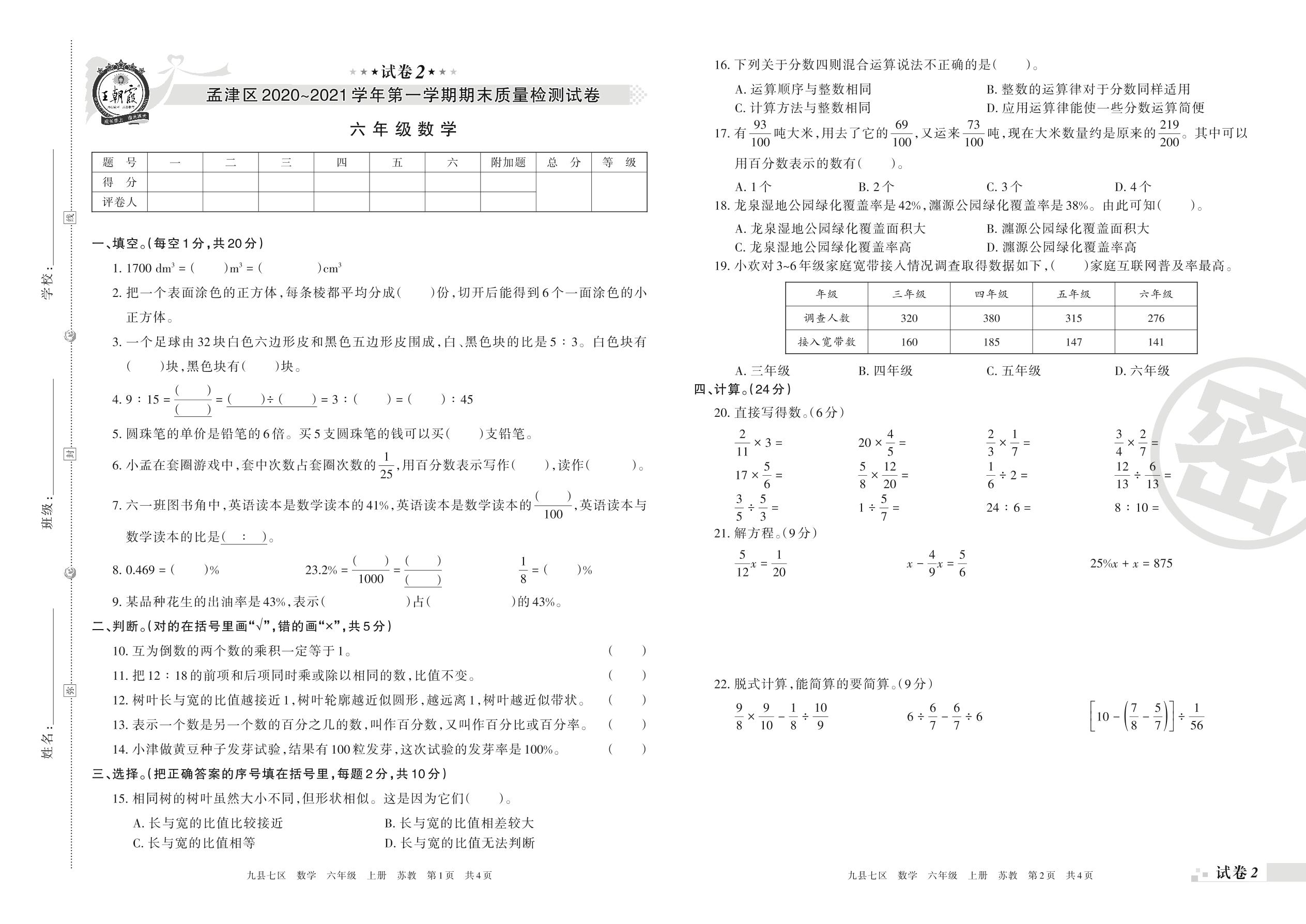 孟津区2020~2021学年第一学期期末质量检测试卷六年级数学(苏教版)【2】