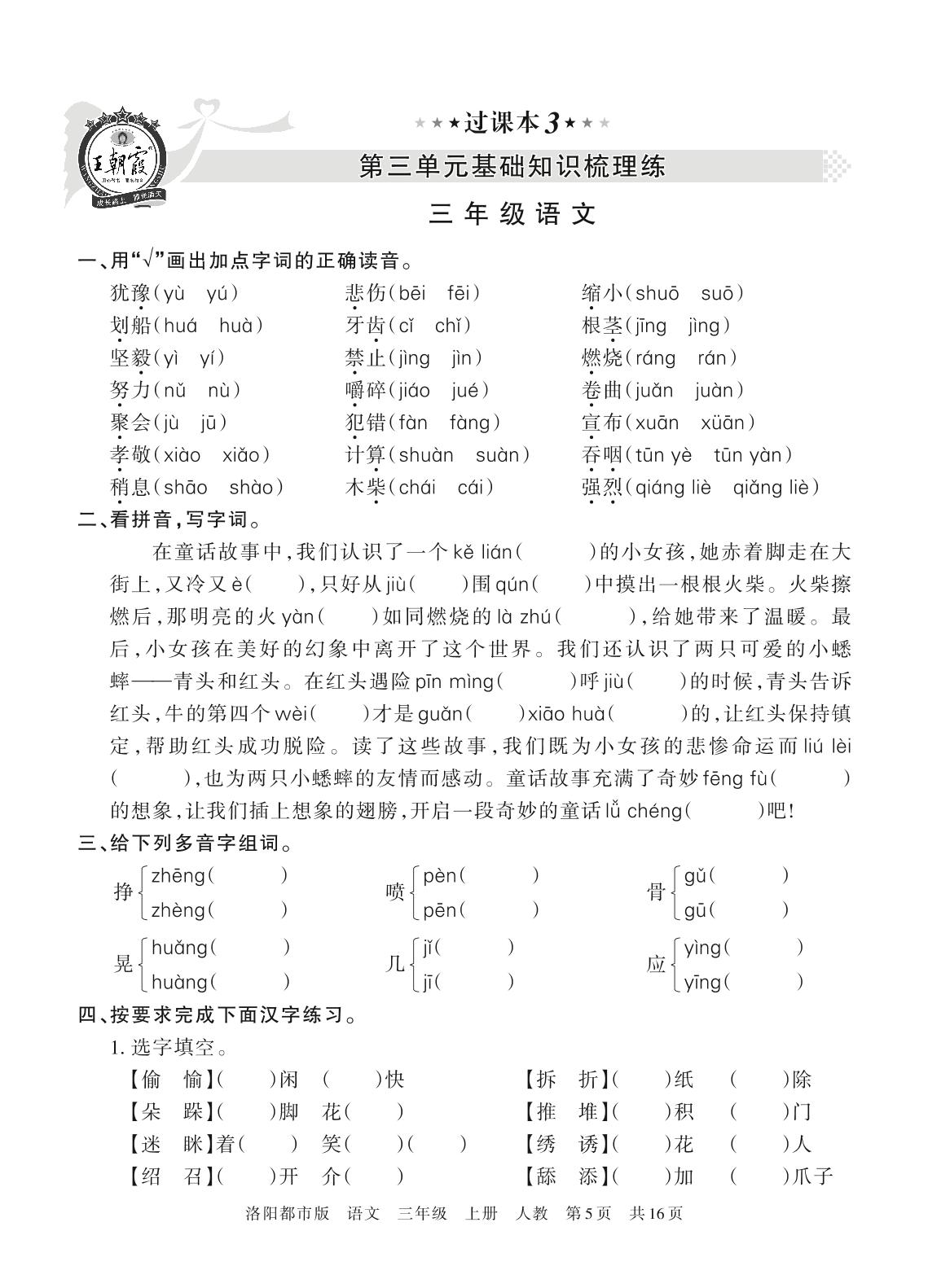 王朝霞期末过课本——第三单元基础知识梳理练三年级上册语文(人教版)_R211125085604428【3】