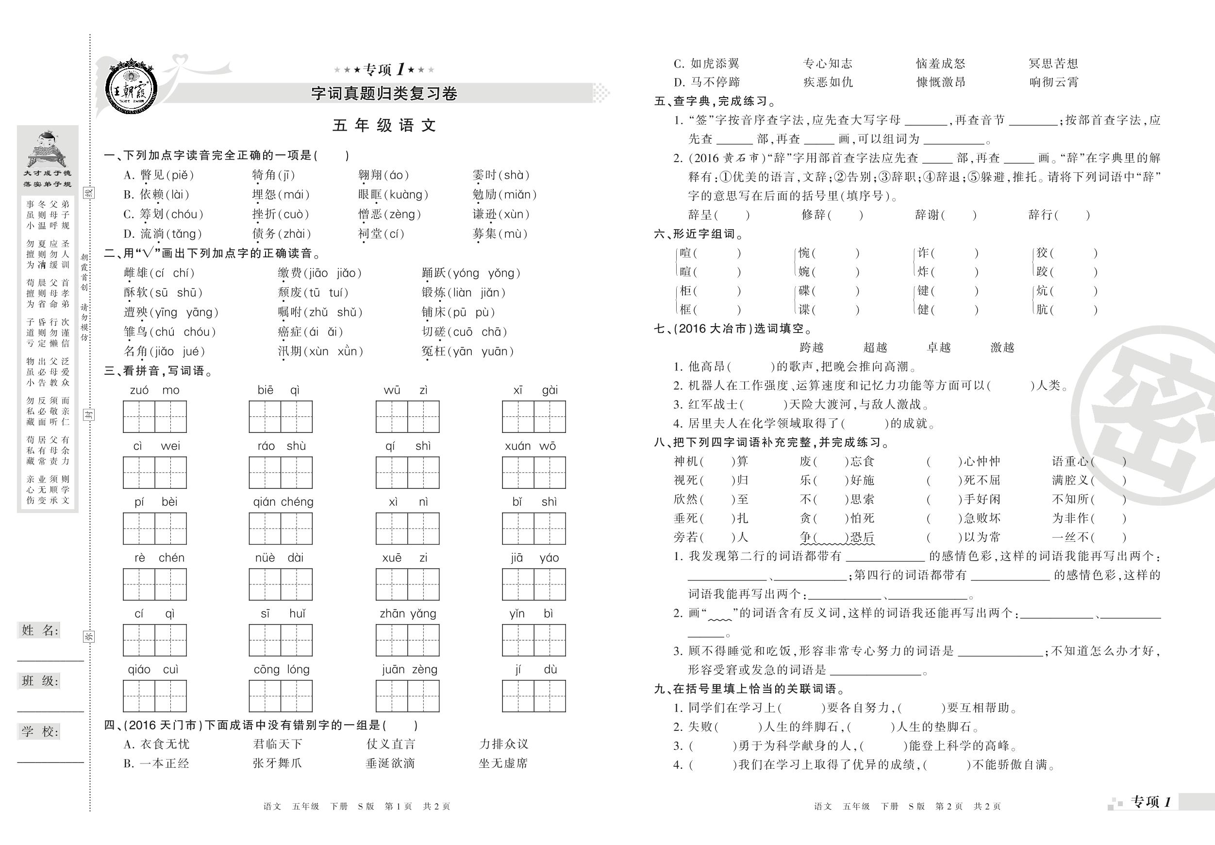 王朝霞期末专项卷——字词、句子真题归类复习卷五年级下册语文(S版)_R210801203853【0】