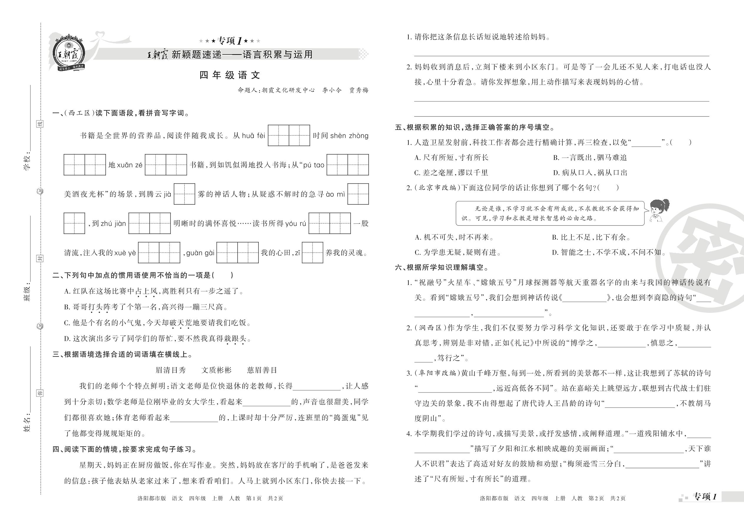 王朝霞期末专项卷——新颖题速递:语言积累与运用四年级上册语文(人教版)_R211125090043783【1】