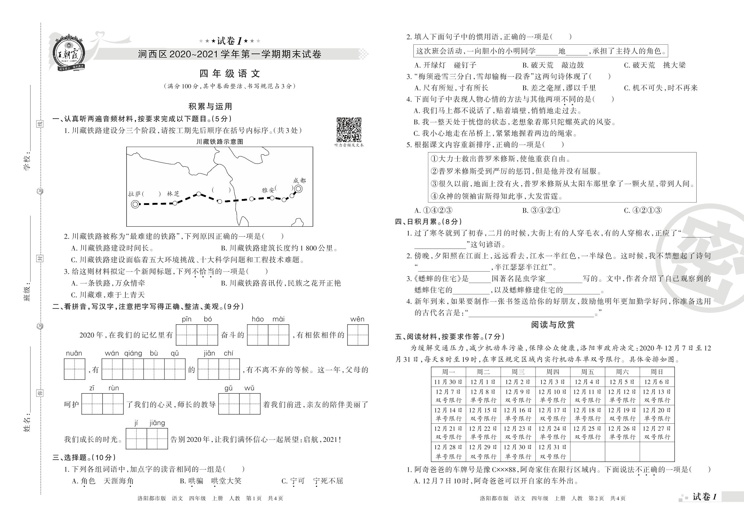 涧西区2020~2021学年第一学期期末试卷四年级语文(人教版)【1】