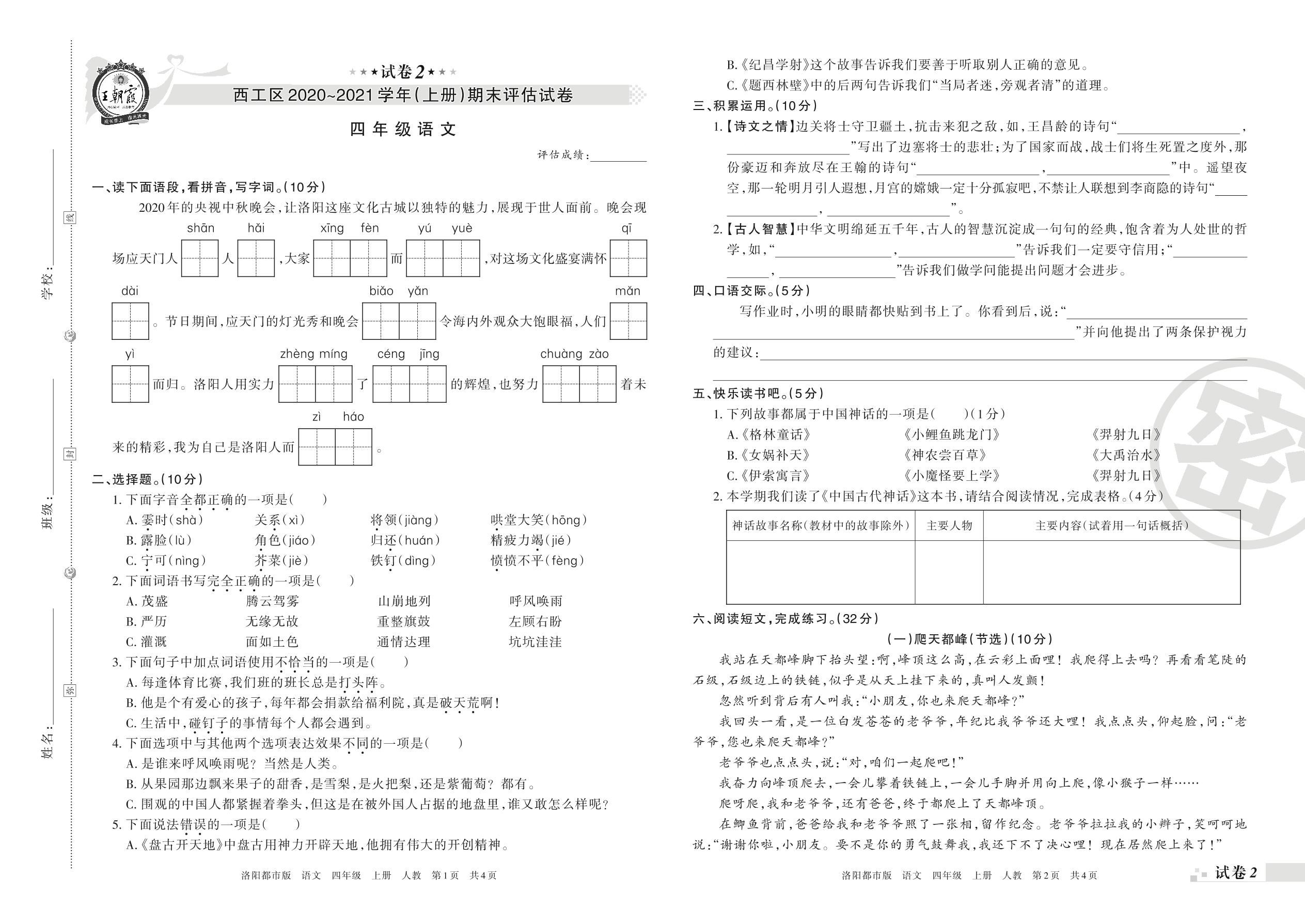 西工区2020~2021学年(上册)期末评估试卷四年级语文(人教版)【2】