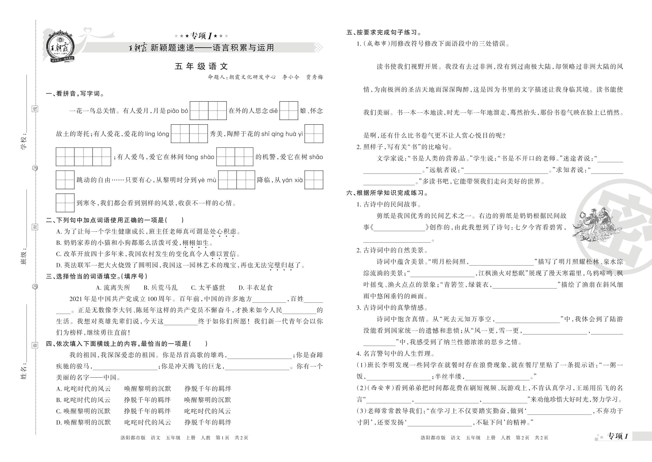 王朝霞期末专项卷——新颖题速递:语言积累与运用五年级上册语文(人教版)_R211125090404900【1】