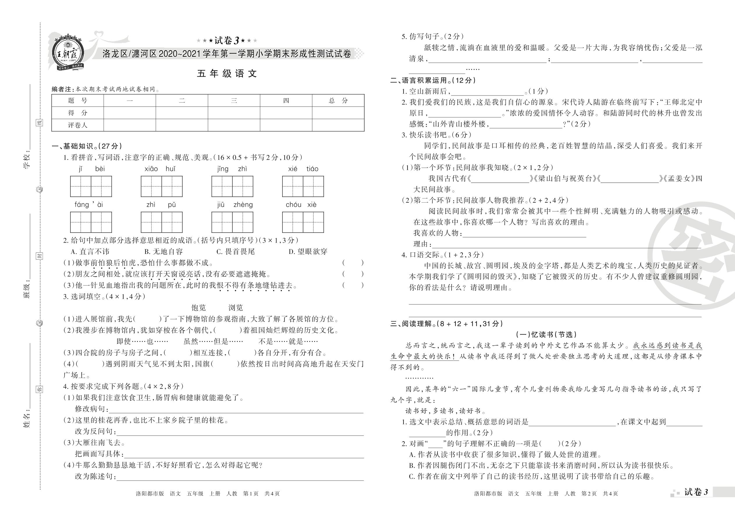 洛龙区、瀍河区2020~2021学年第一学期小学期末形成性测试试卷五年级语文(人教版)【3】