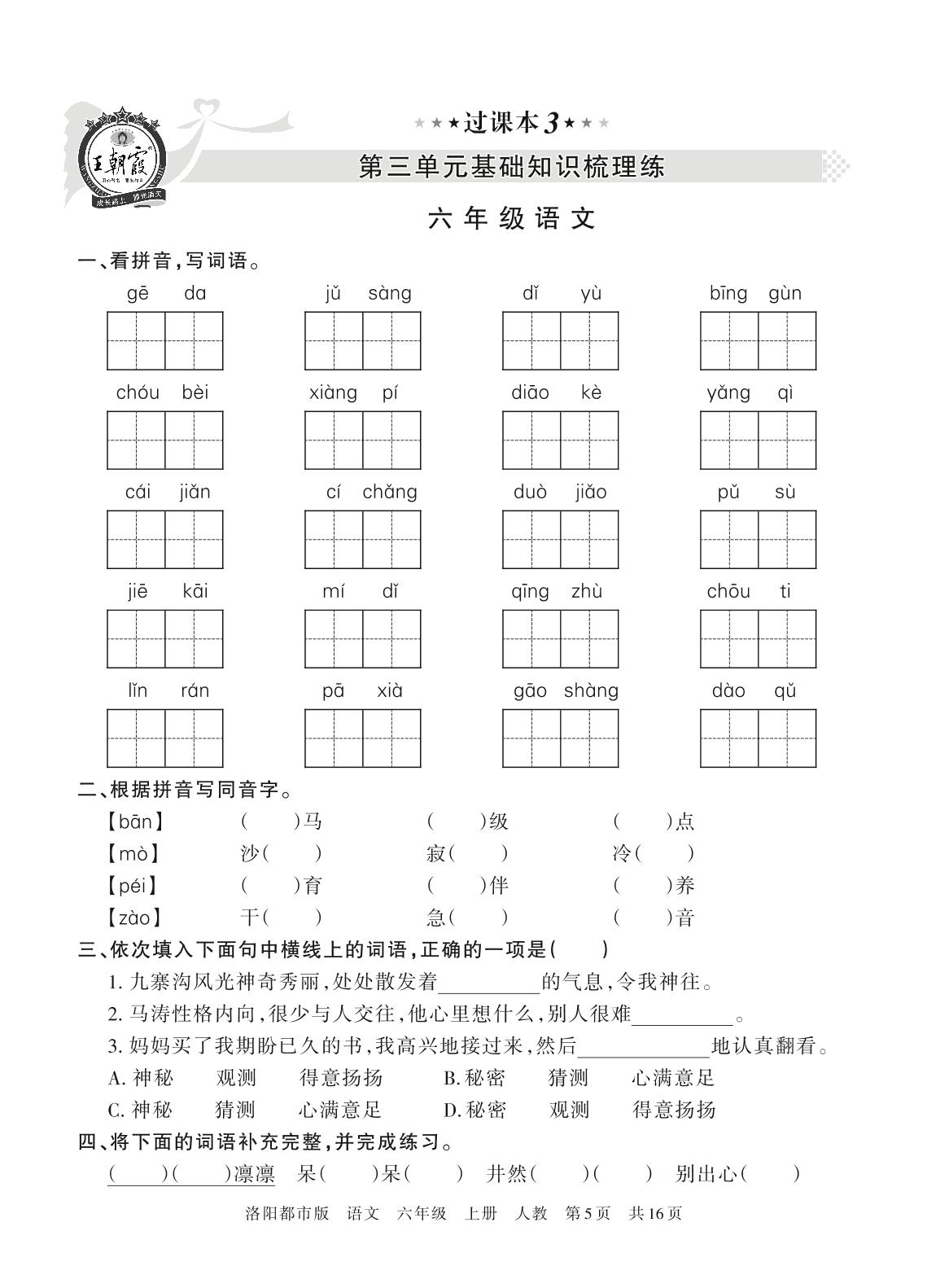 王朝霞期末过课本——第三单元基础知识梳理练六年级上册语文(人教版)_R211125090819022【3】