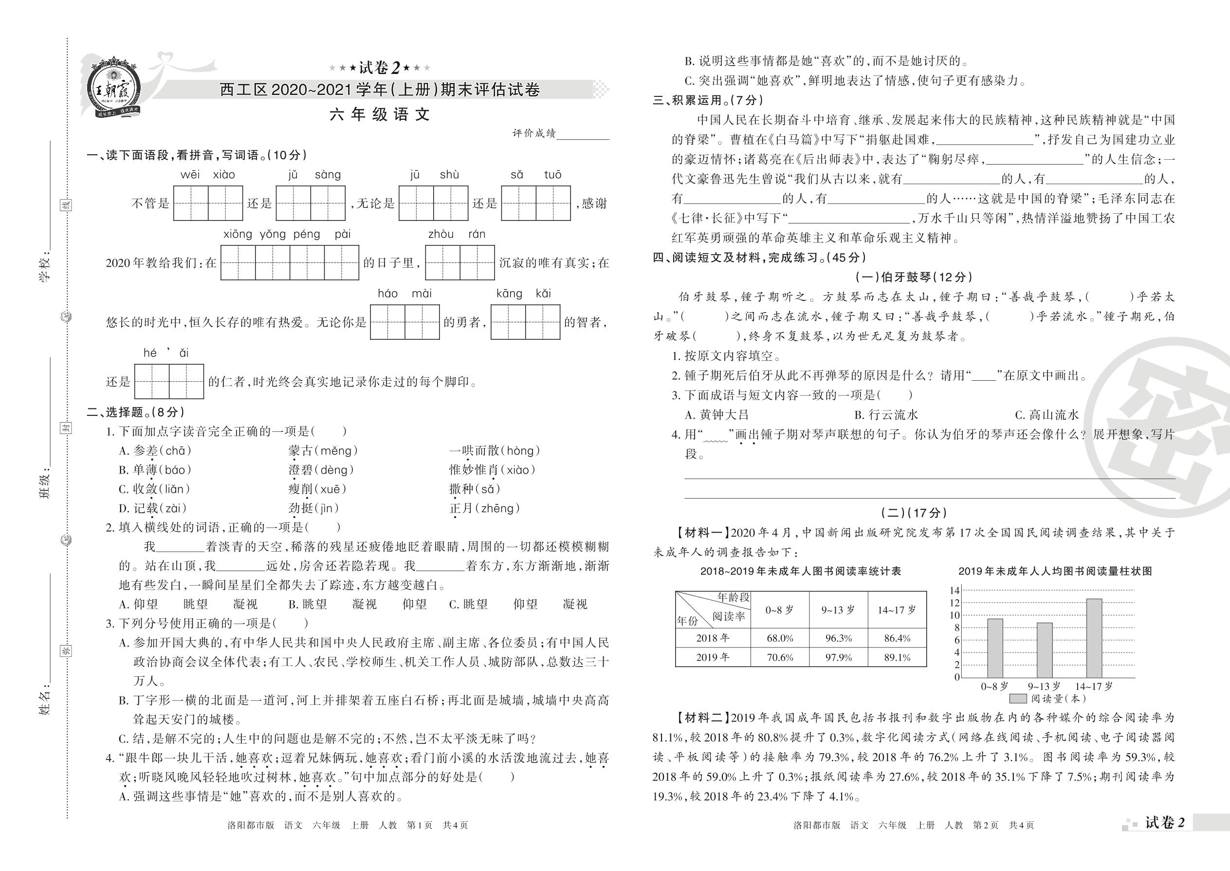 西工区2020~2021学年(上册)期末评估试卷六年级语文(人教版)【2】