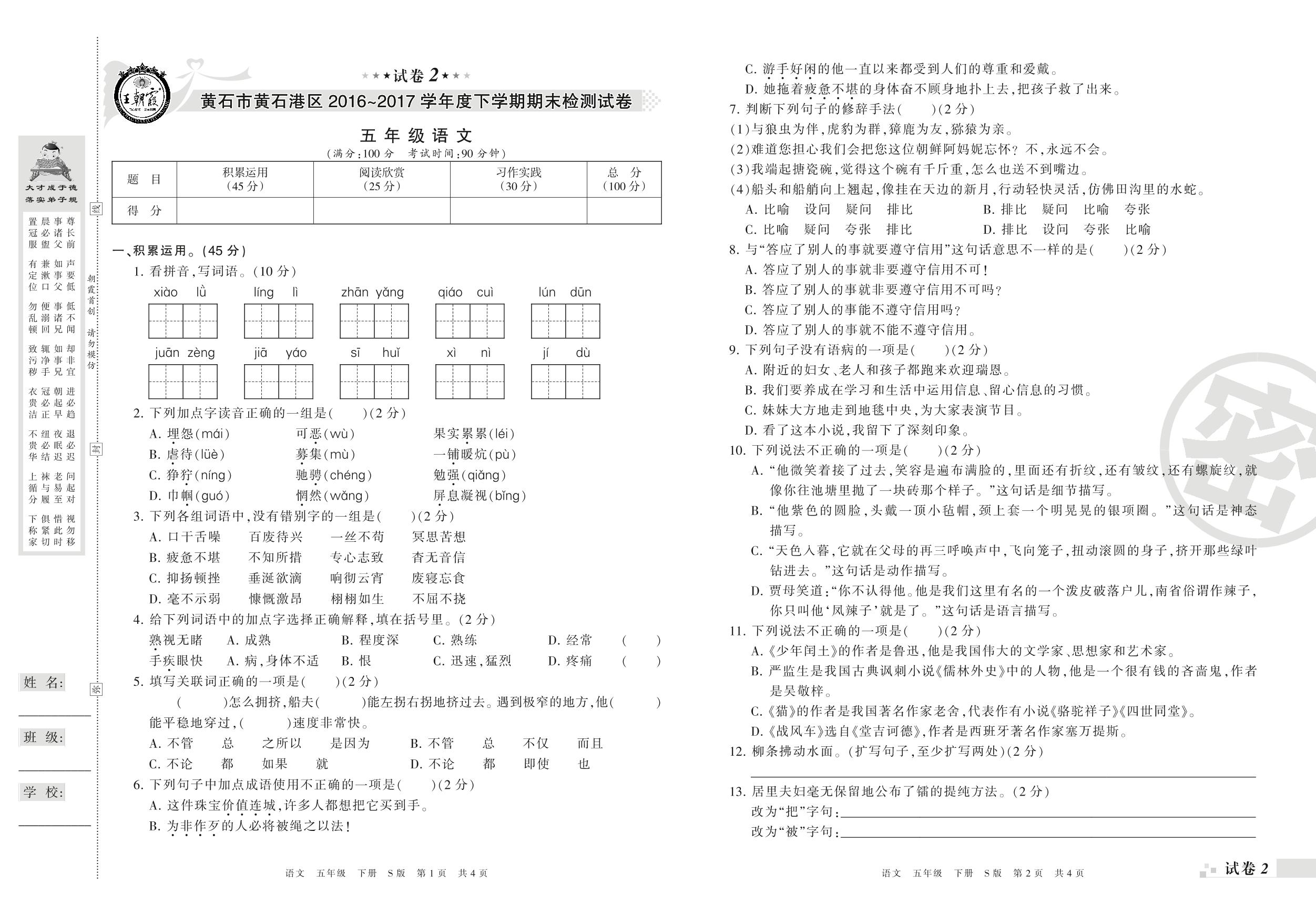 2016-2017学年第二学期黄石市黄石港区五年级语文试卷(S版)【2】