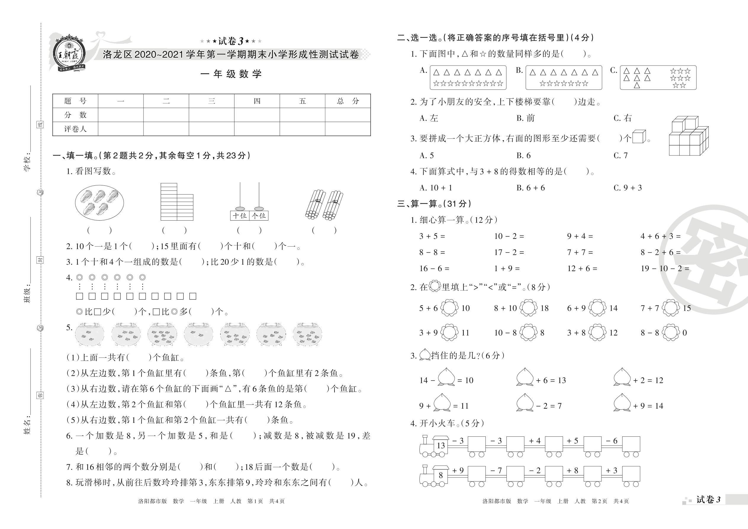 洛龙区2020~2021学年第一学期期末小学形成性测试试卷一年级数学(人教版)【3】