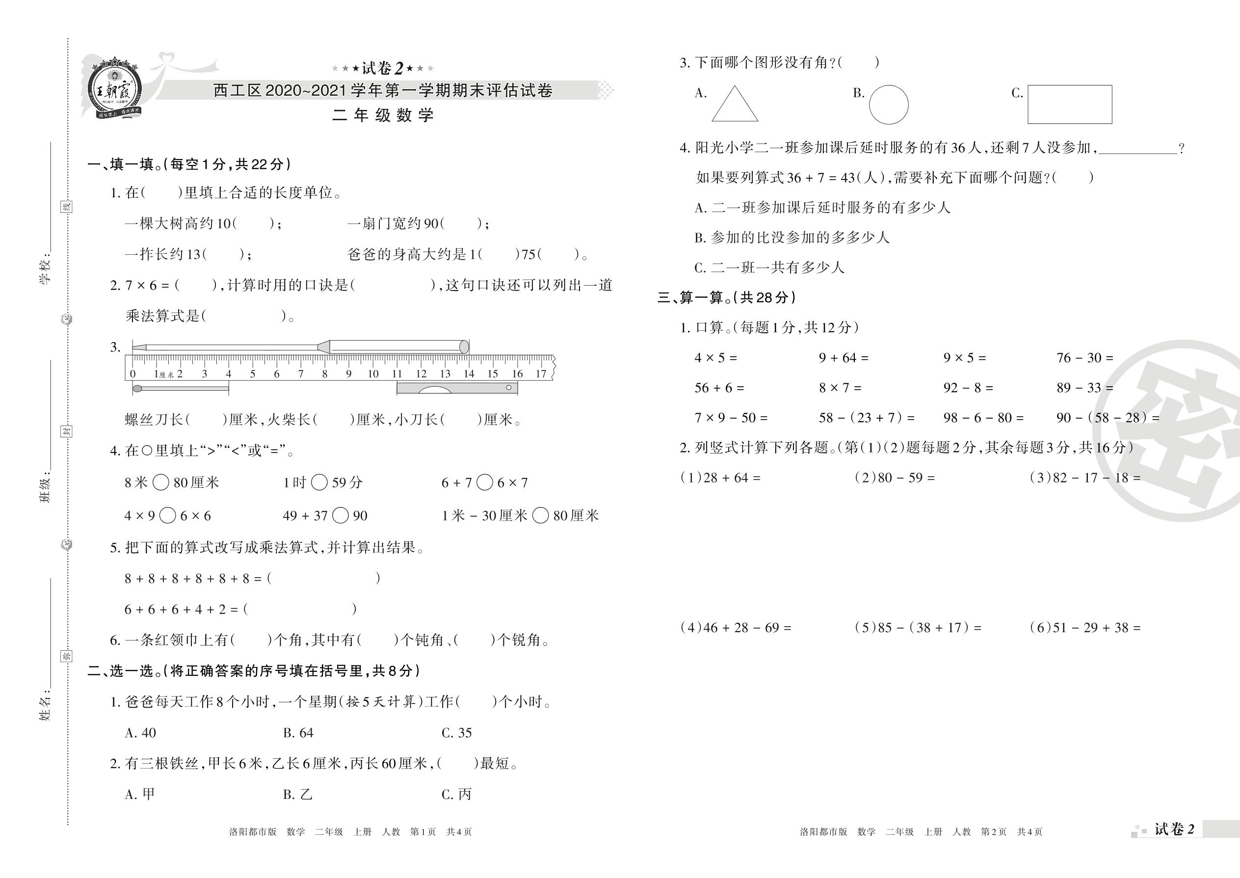西工区2020~2021学年第一学期期末评估试卷二年级数学(人教版)【2】