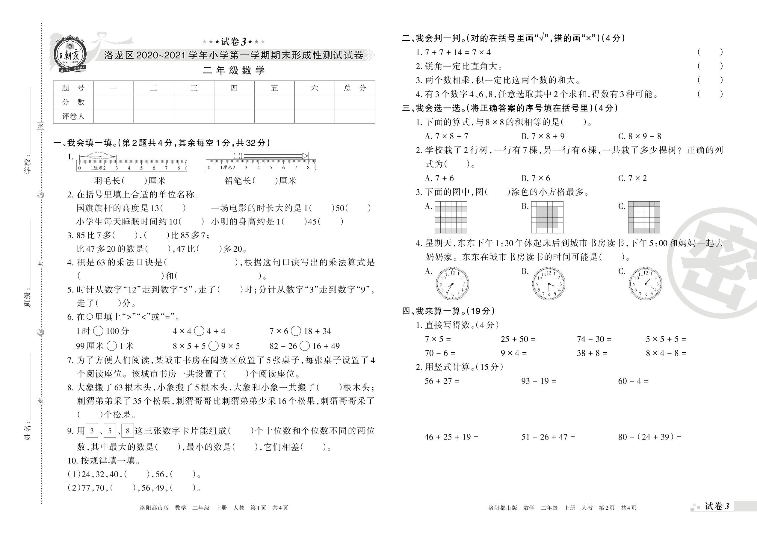 洛龙区2020~2021学年小学第一学期期末形成性测试试卷二年级数学(人教版)【3】