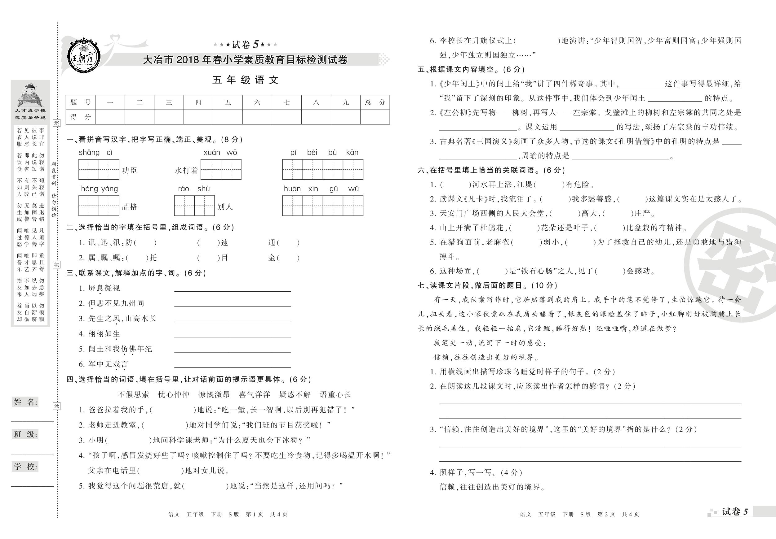 2017-2018学年第二学期大冶市五年级语文试卷(S版)【5】