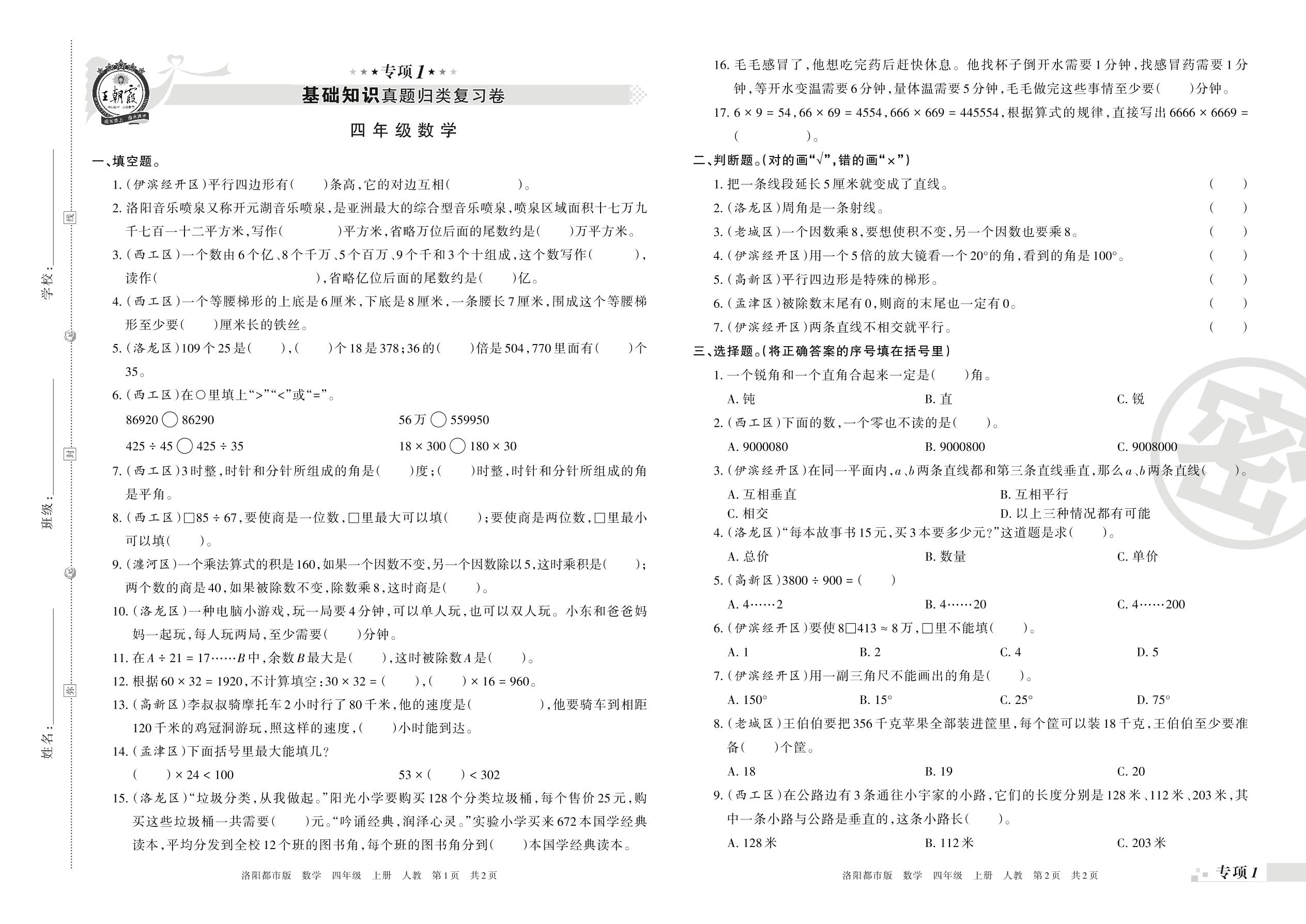 王朝霞期末专项卷——基础知识真题归类复习卷四年级上册数学(人教版)_R211125100711203【1】