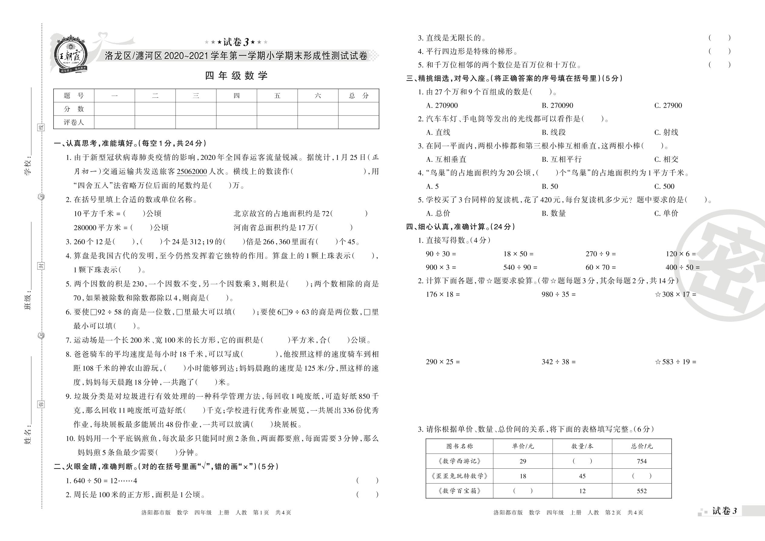 洛龙区、瀍河区2020~2021学年第一学期小学期末形成性测试试卷四年级数学(人教版)_R211125100711729【3】