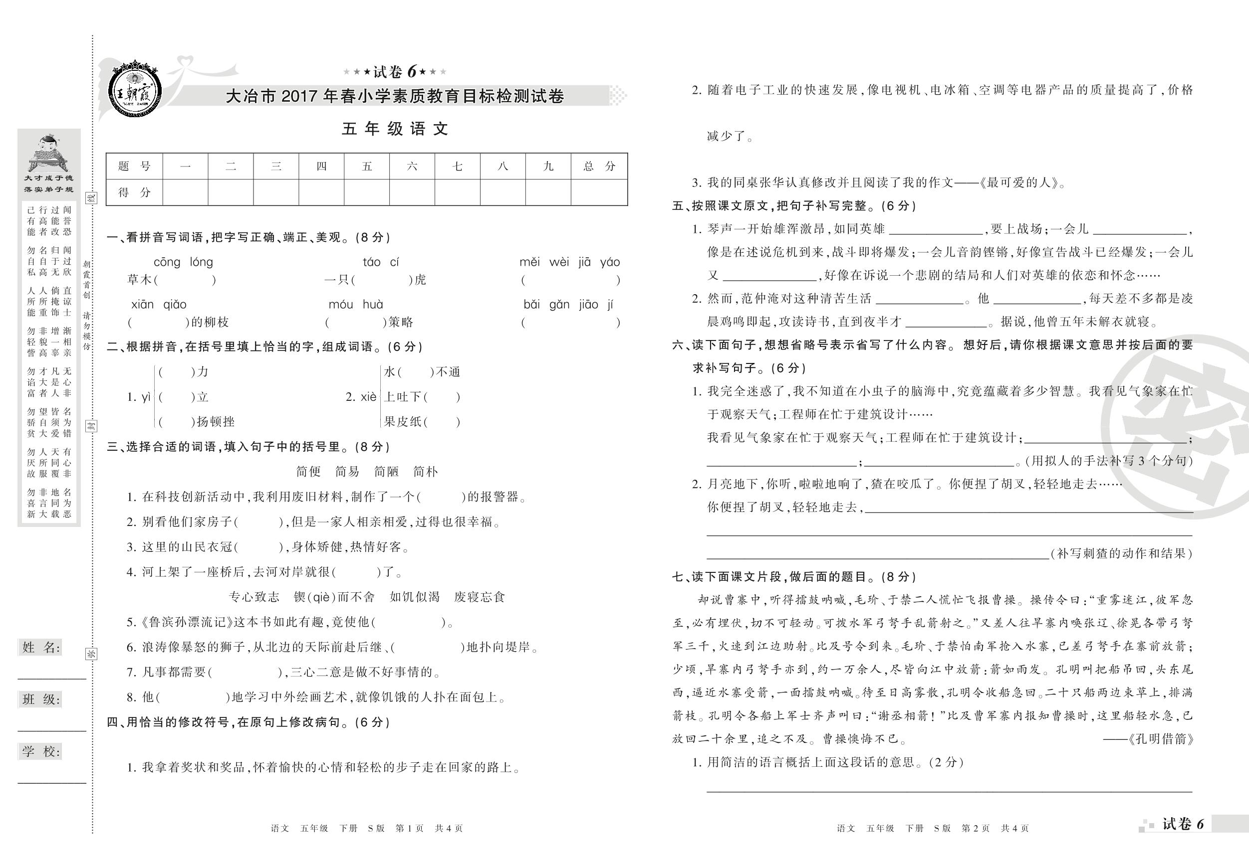 2016-2017学年第二学期大冶市五年级语文试卷(S版)【6】