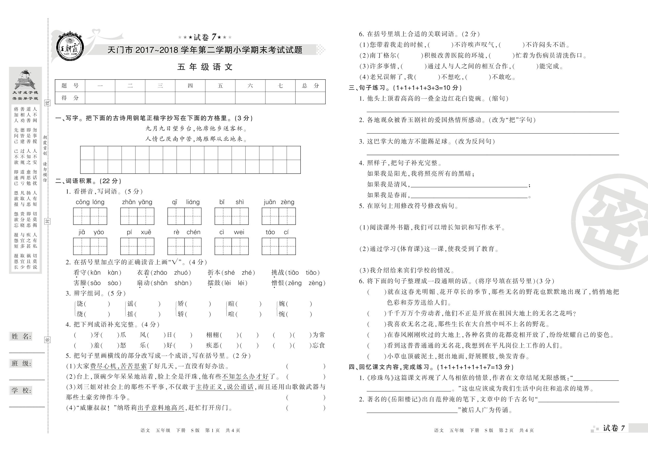 2017-2018学年第二学期天门市五年级语文试卷(S版)【7】