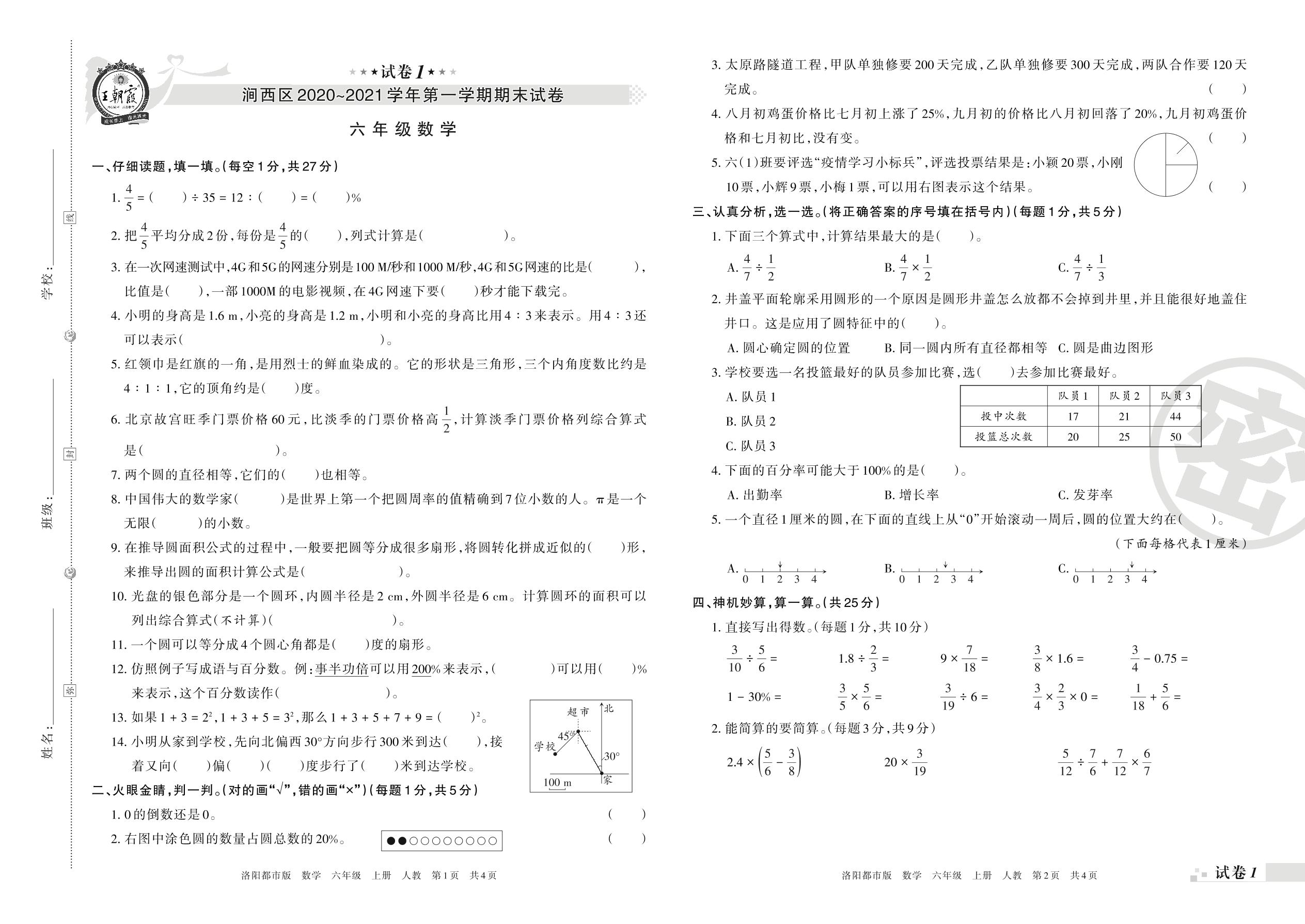 涧西区2020~2021学年第一学期期末试卷六年级数学(人教版)【1】