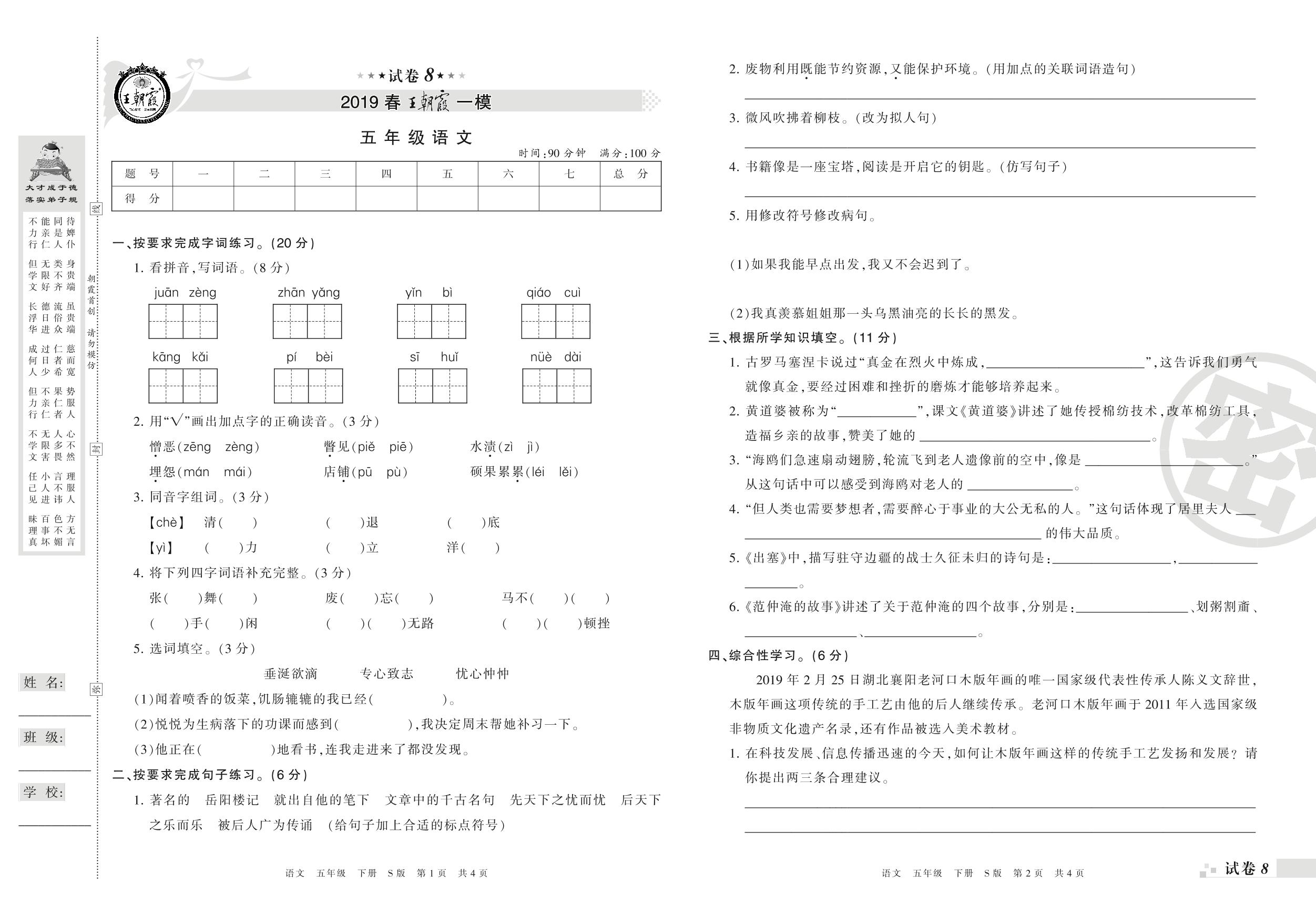 王朝霞期末模拟卷五年级下册语文(S版)_R210801203931【8】