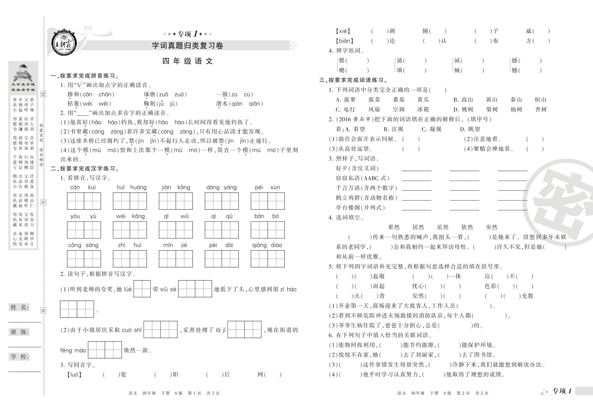 王朝霞期末专项卷——字词、句子真题归类复习卷四年级下册语文(S版)_R210801203948【0】