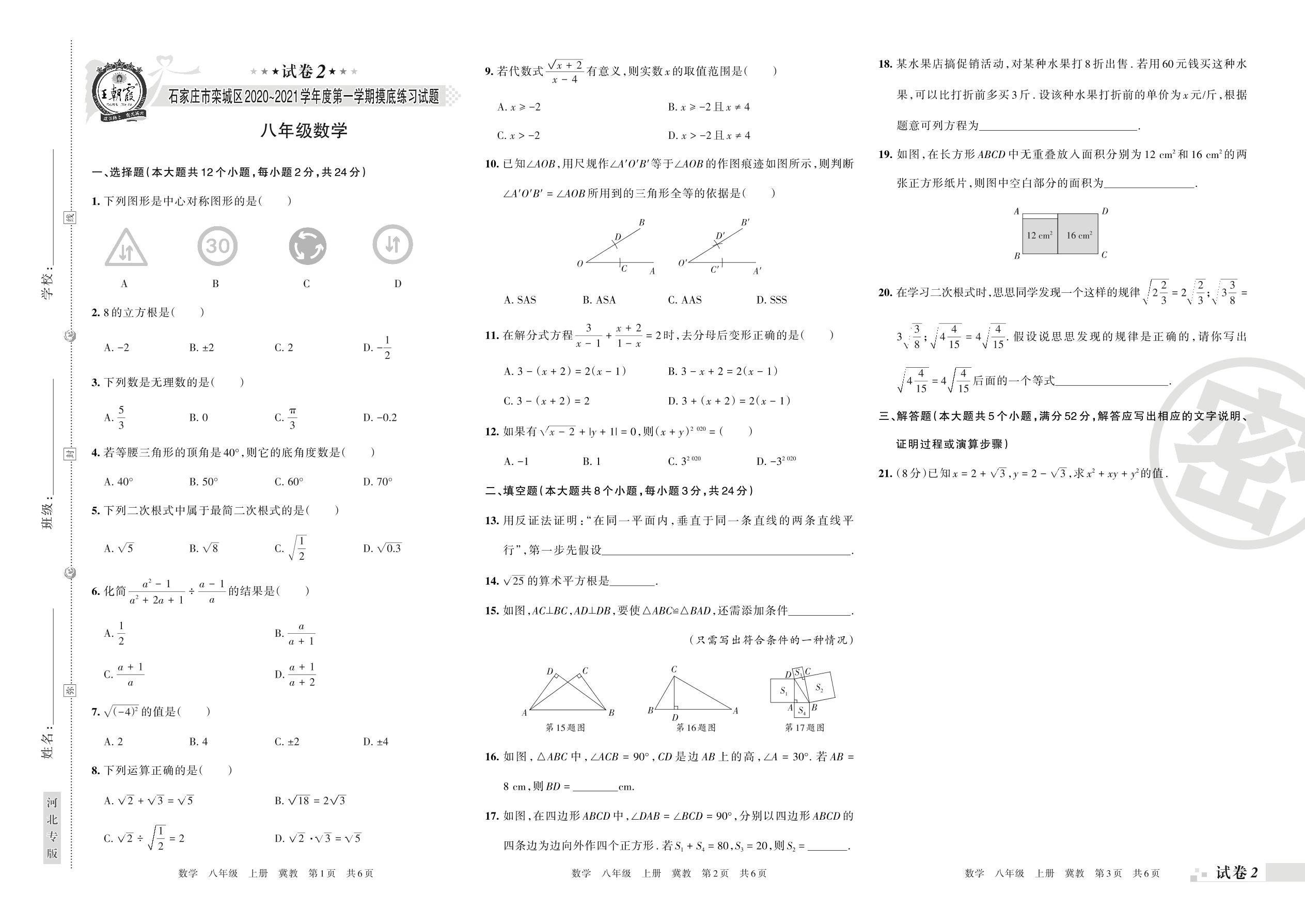 石家庄市栾城区2020~2021学年度第一学期摸底练习试题八年级数学(冀教版)【2】