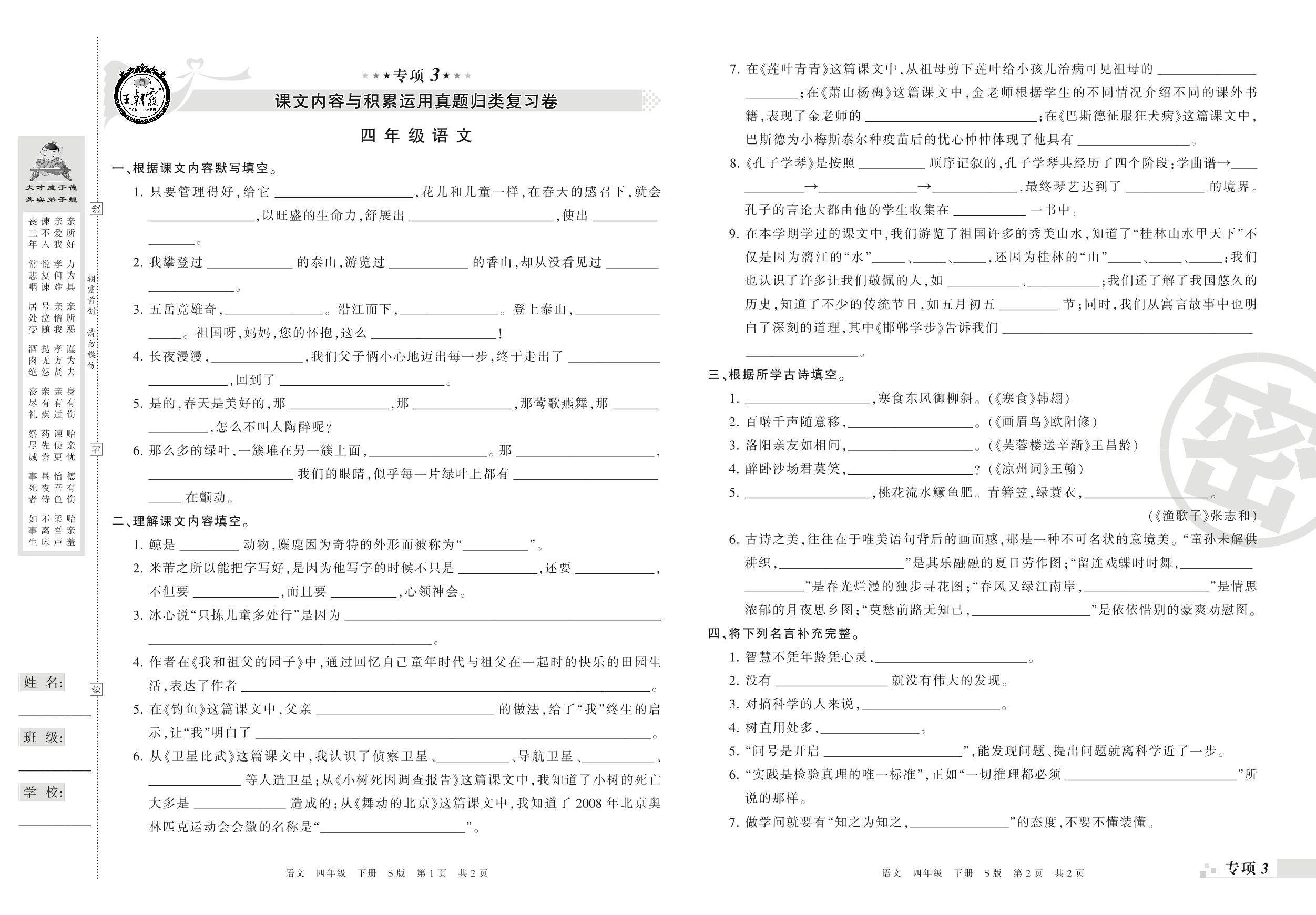 王朝霞期末专项卷——课文内容与积累运用、课内阅读与写作真题归类复习卷四年级下册语文(S版)_R210801203951【0】
