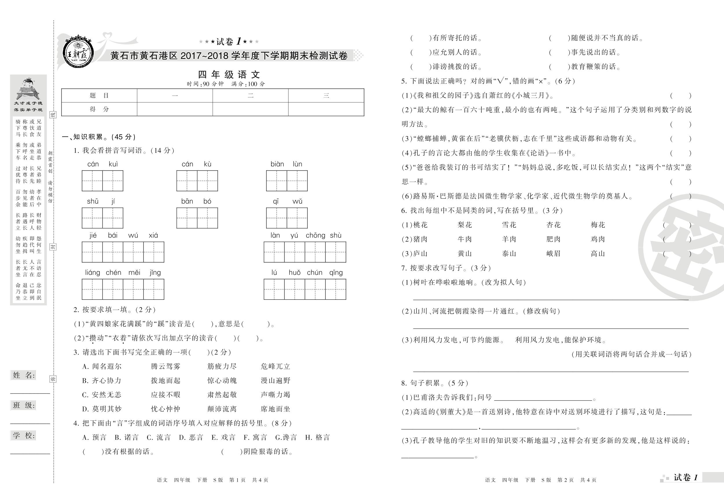 2017-2018学年第二学期黄石市黄石港区四年级语文试卷(S版)【1】