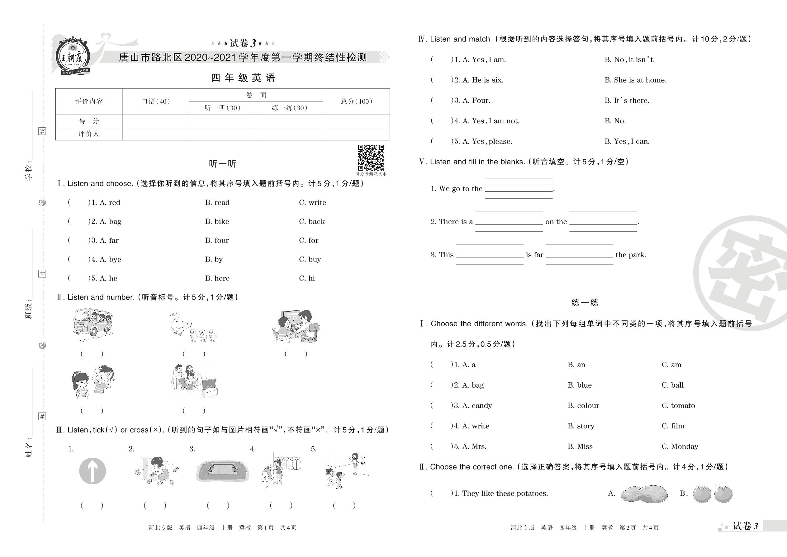 唐山市路北区2020~2021学年度第一学期终结性检测四年级上册英语(冀教版)【3】