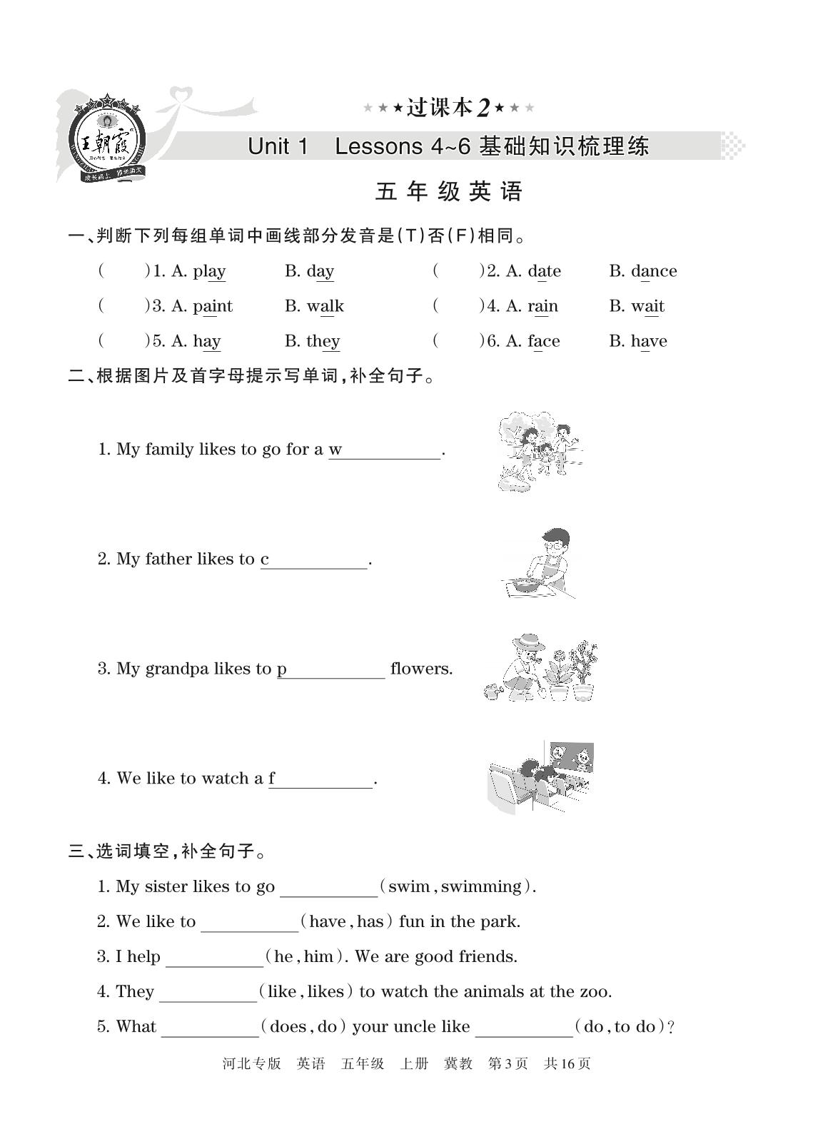 王朝霞期末过课本——Unit 1 Lessons 4~6 基础知识梳理练五年级上册英语(冀教版)【2】