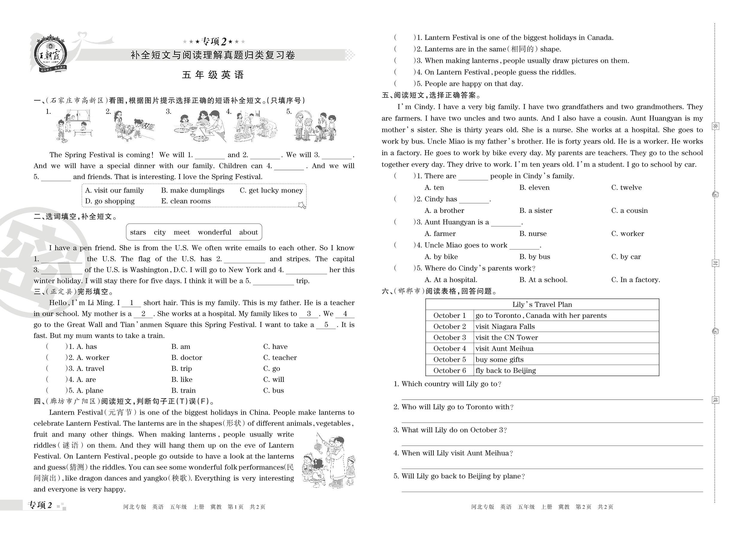 王朝霞期末专项卷——补全短文与阅读理解真题归类复习卷五年级上册英语(冀教版)【2】