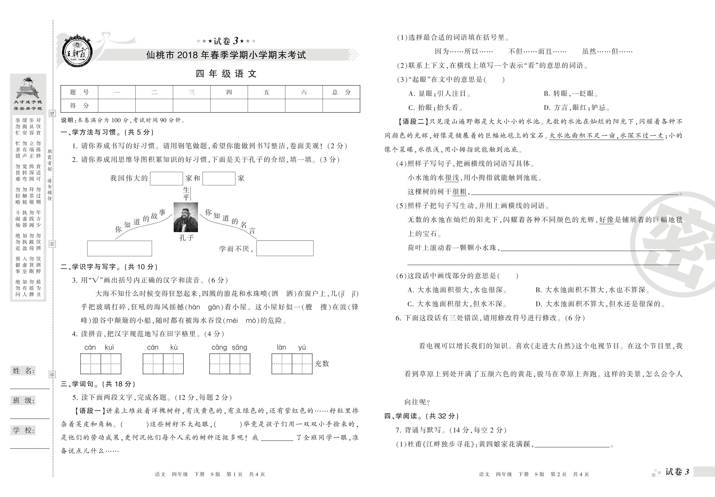 2017-2018学年第二学期仙桃市四年级语文试卷(S版)【3】