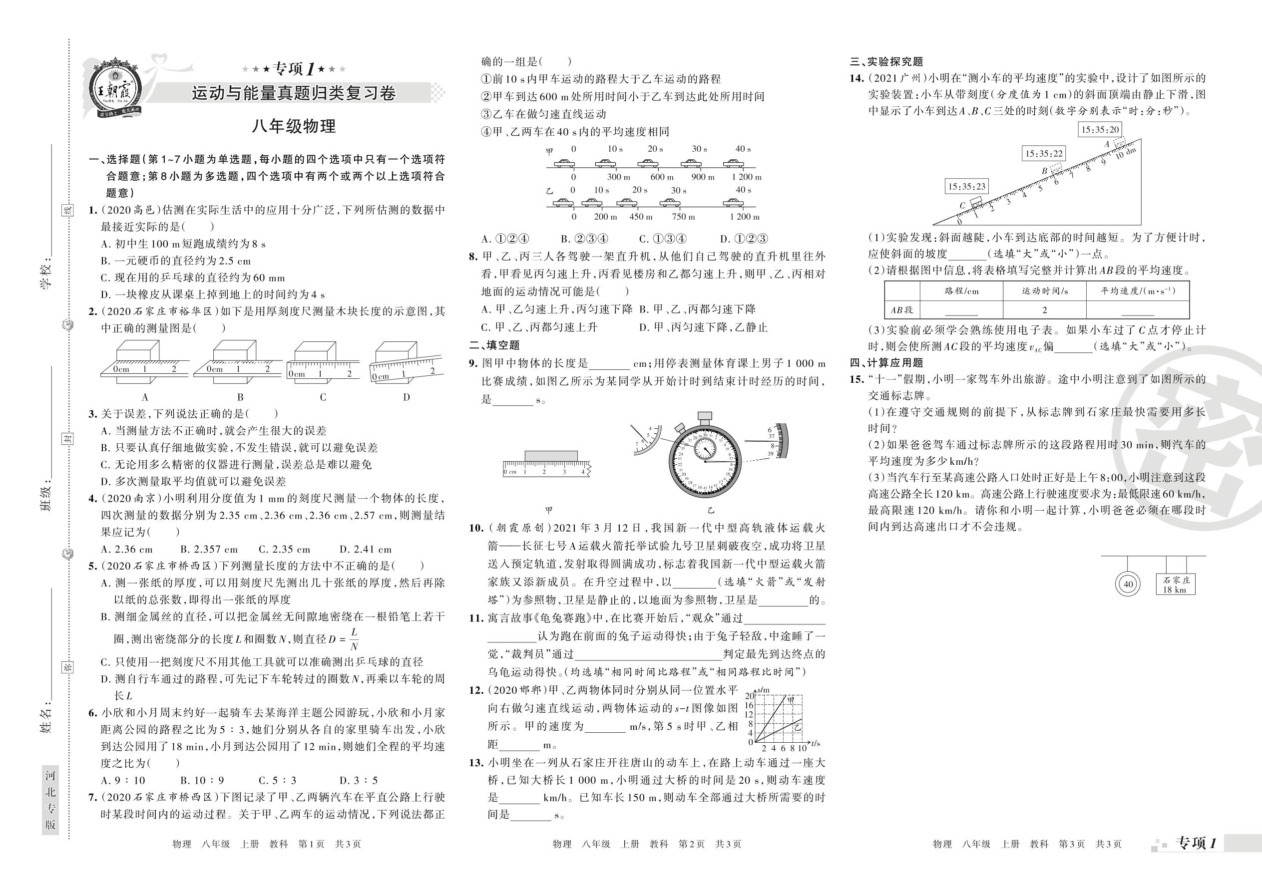 王朝霞期末专项卷——运动与能量真题归类复习卷八年级上册物理(教科版)【1】