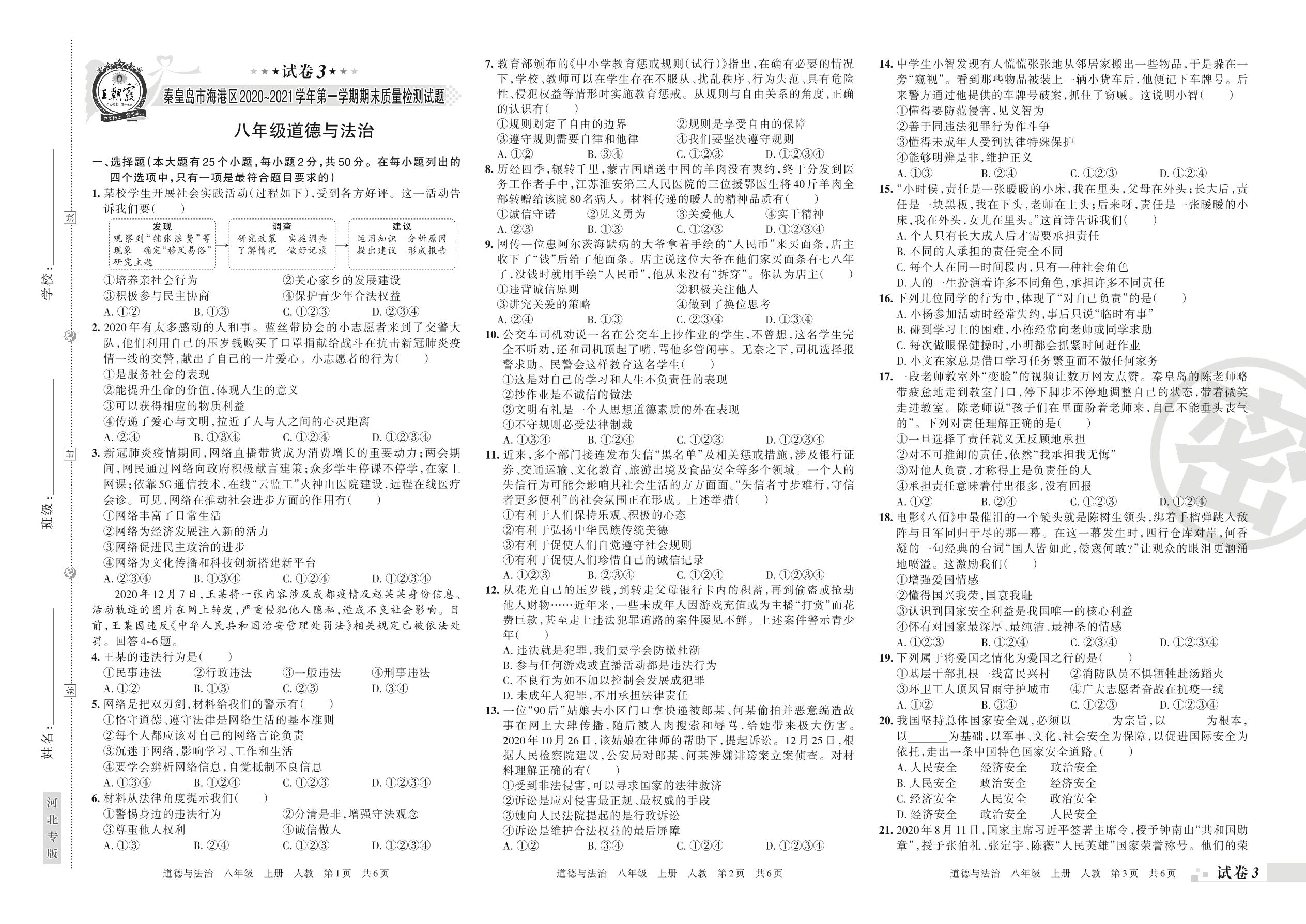 秦皇岛市海港区2020~2021学年第一学期期末质量检测试题八年级道德与法治(人教版)【3】
