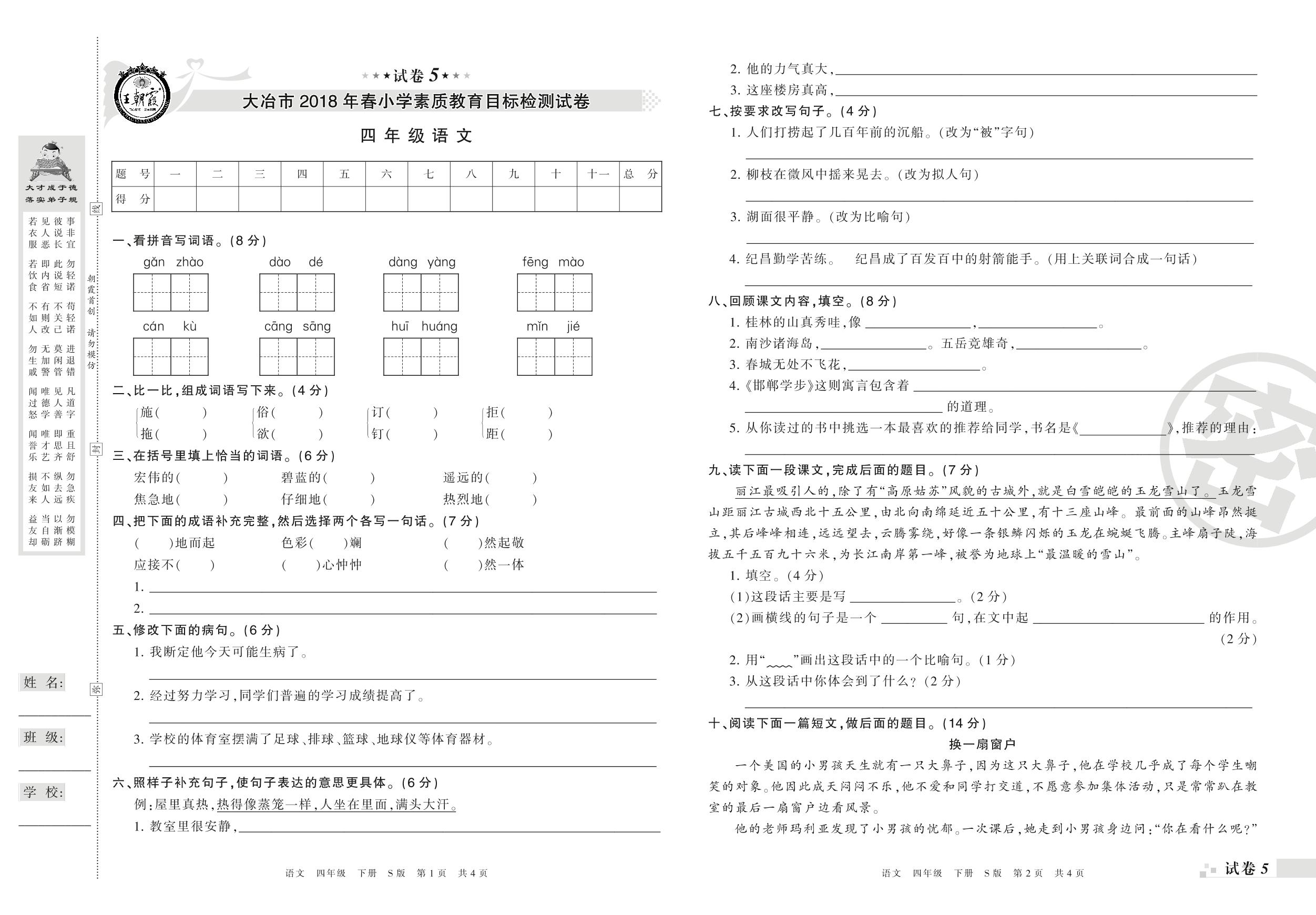 2017-2018学年第二学期大冶市四年级语文试卷(S版)【5】