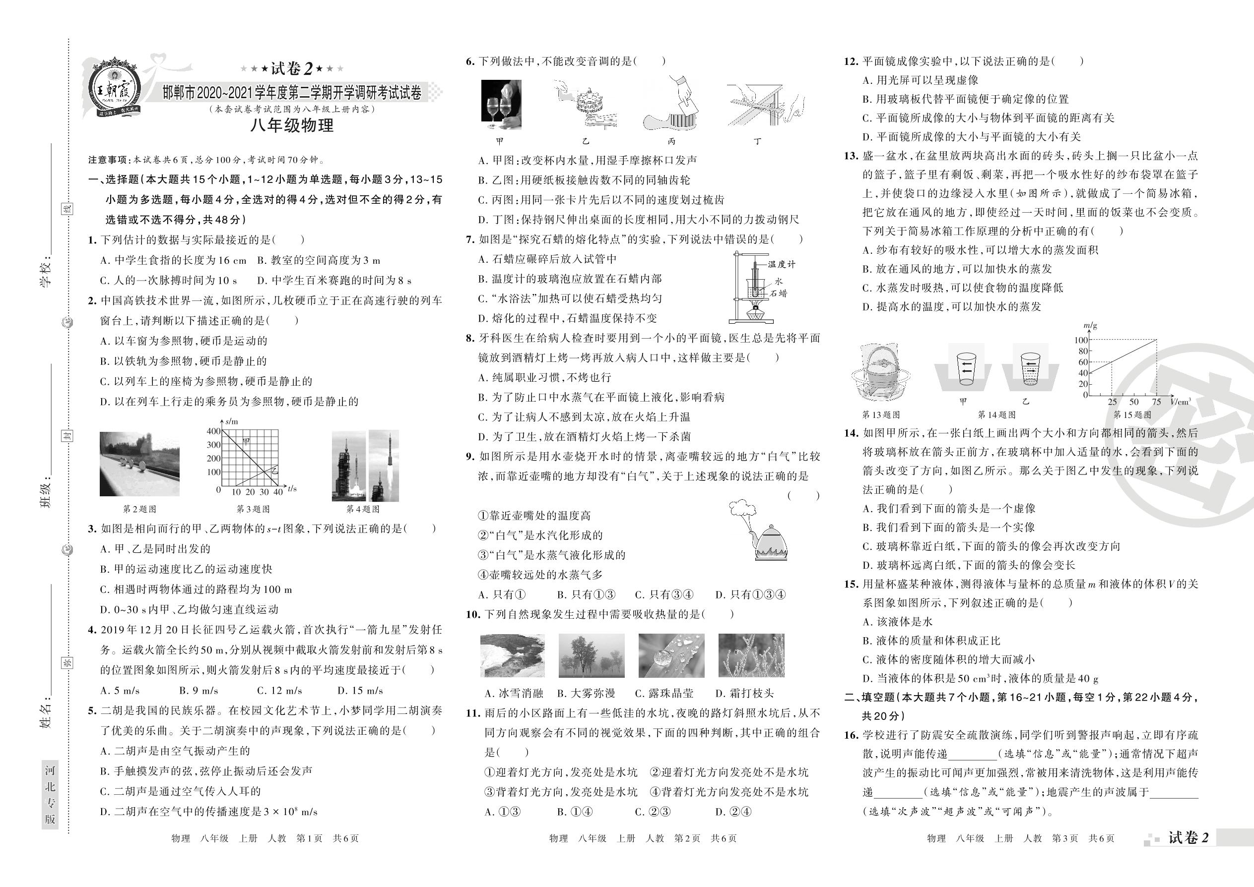 邯郸市2020~2021学年度第二学期开学调研考试试卷八年级物理(人教版)【2】