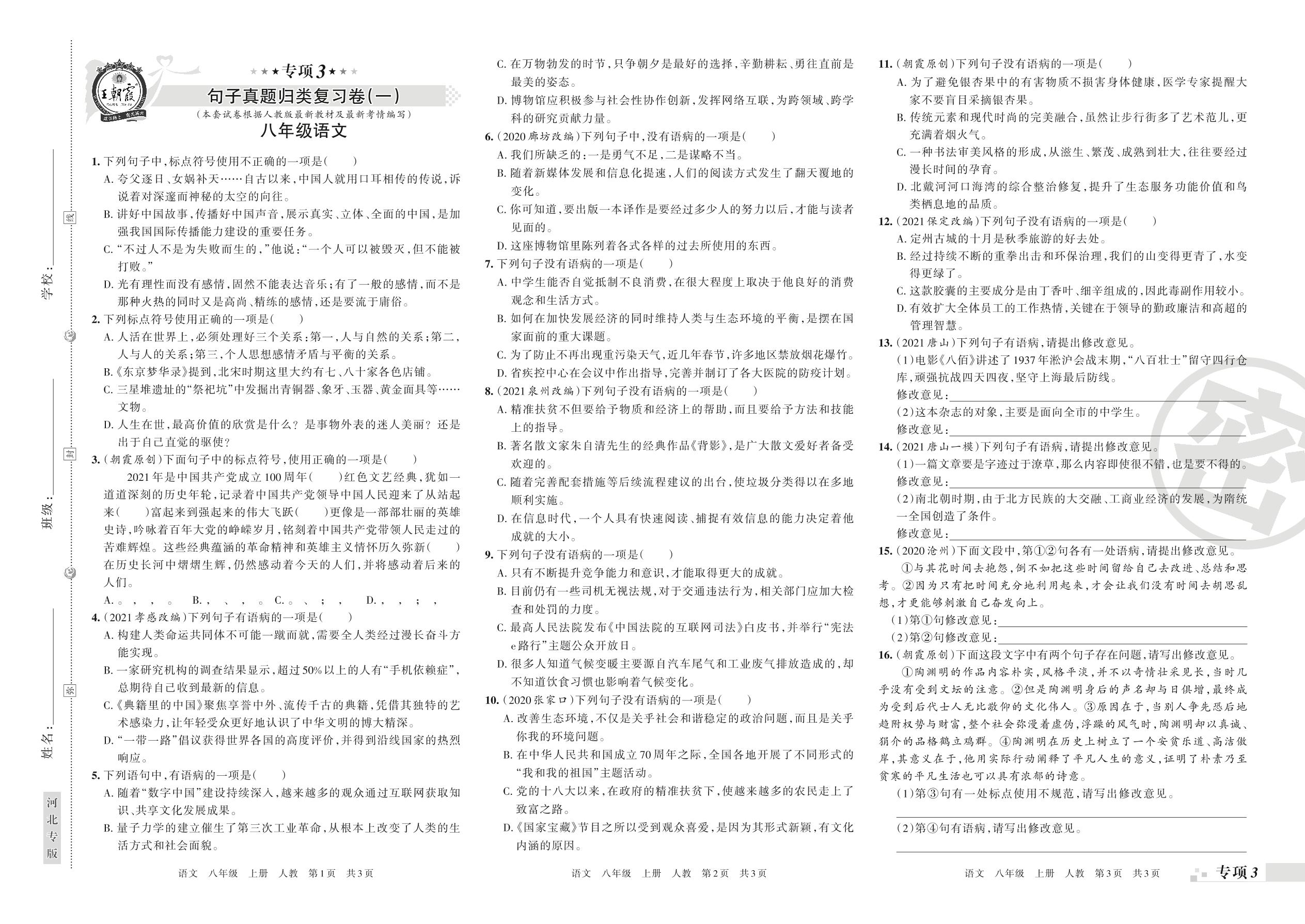 王朝霞期末专项卷——句子真题归类复习卷(一)八年级上册语文(人教版)【3】