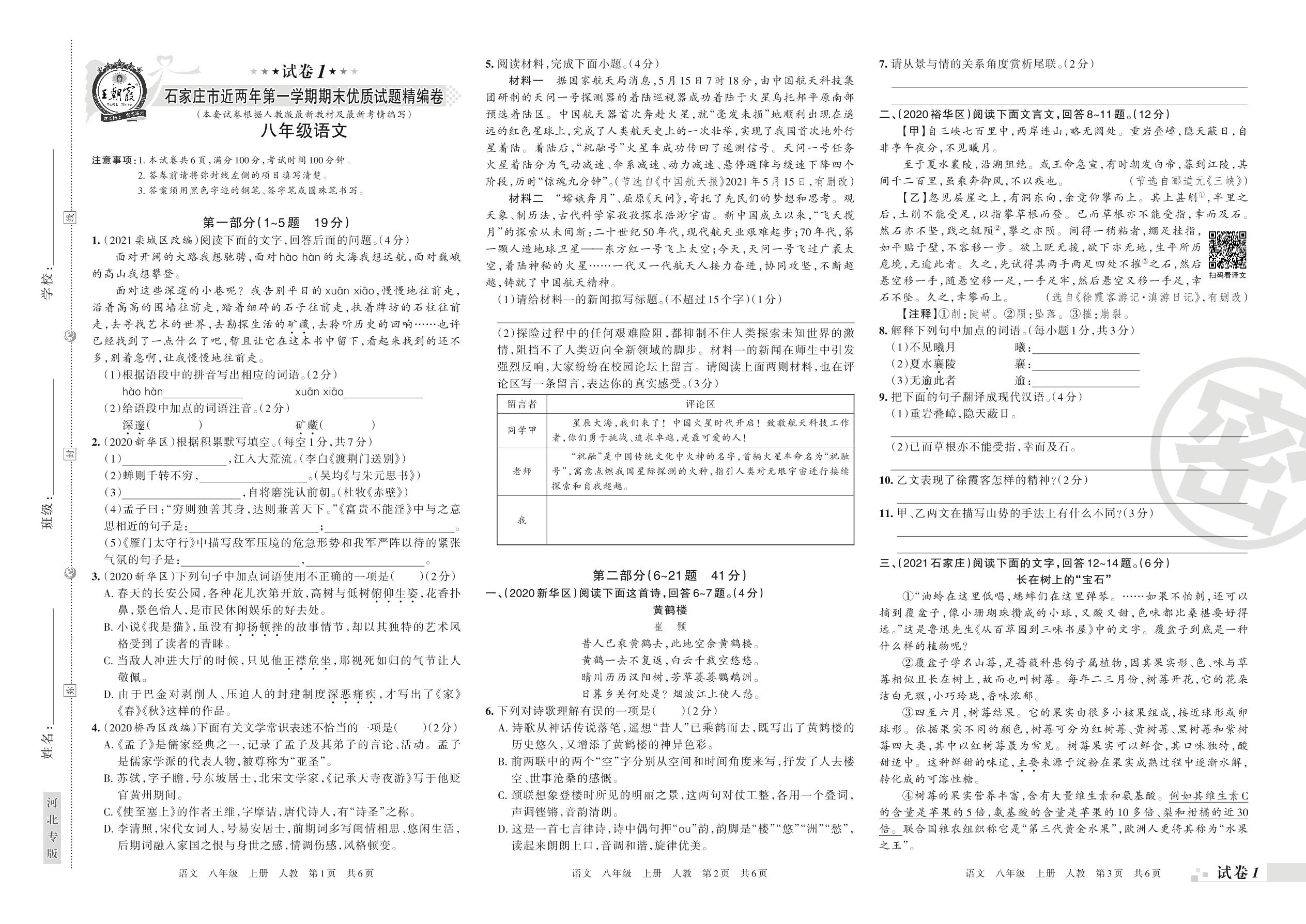 石家庄市近两年第一学期期末优质试题精编卷八年级语文(人教版)【1】