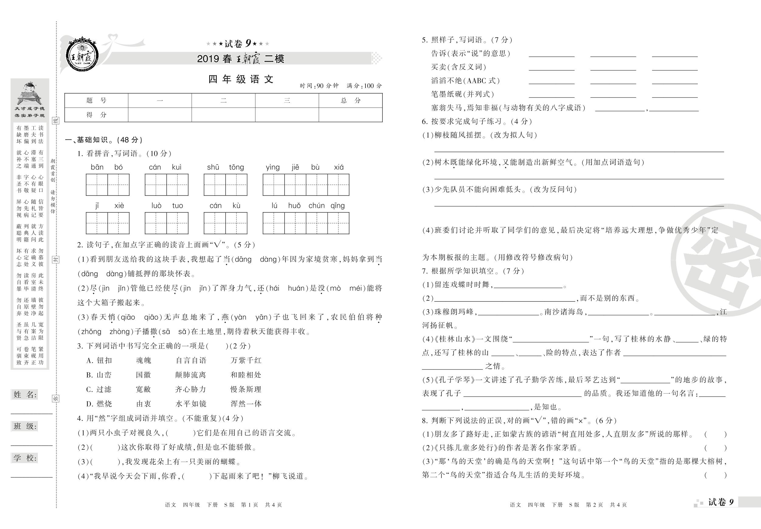 王朝霞期末模拟卷四年级下册语文(S版)_R210801204025【9】