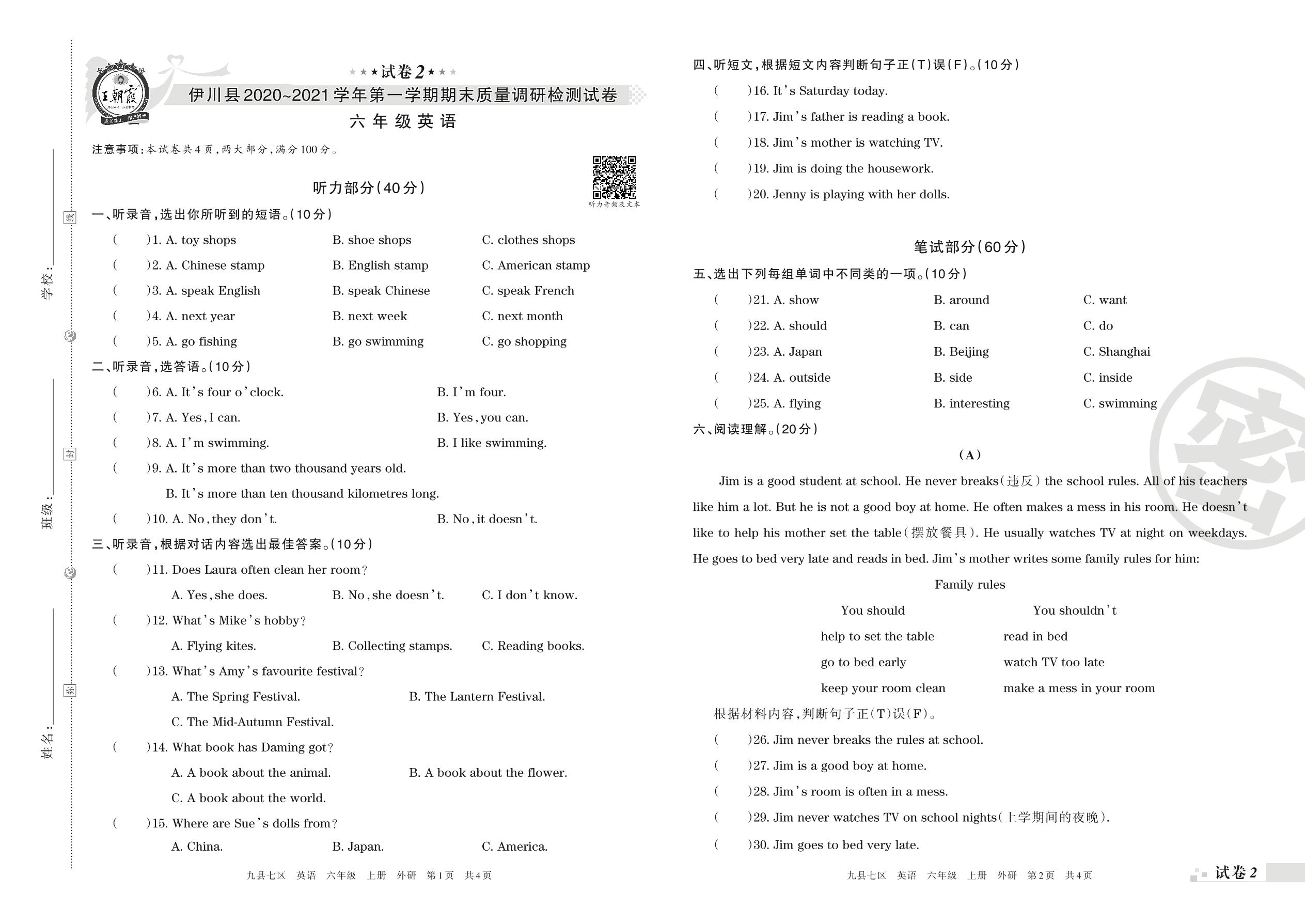 伊川县2020~2021学年第一学期期末质量调研检测试卷六年级英语(外研版)【2】