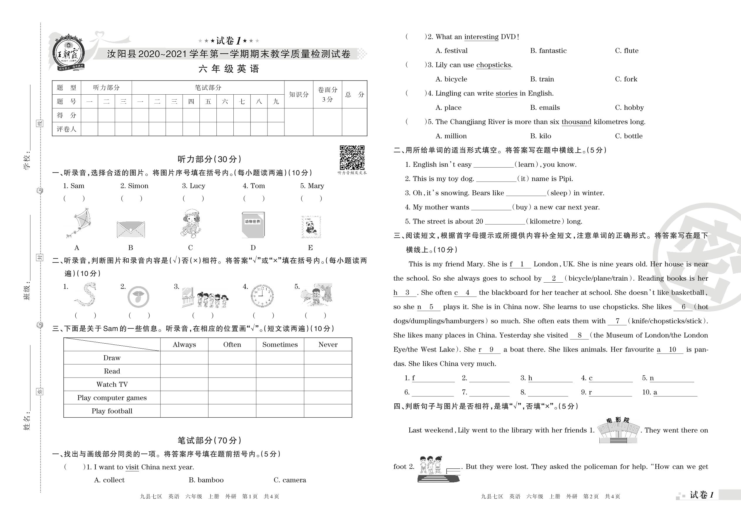 汝阳县2020~2021学年第一学期期末教学质量检测试卷六年级英语(外研版)【1】