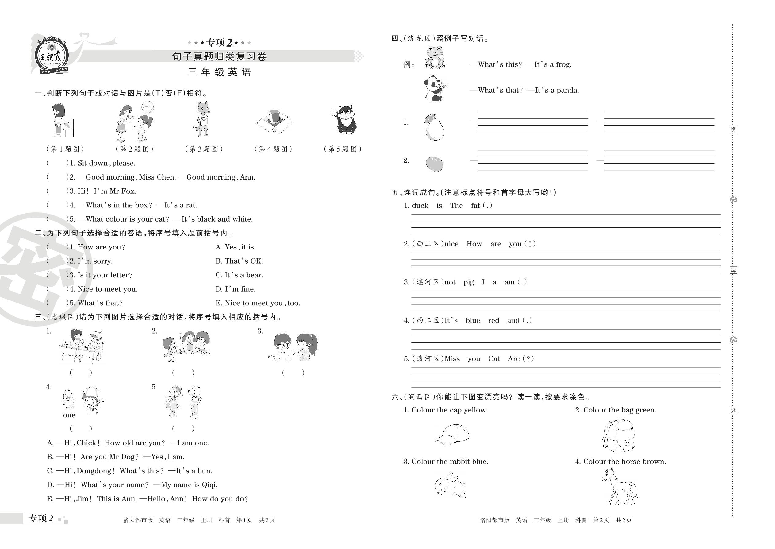 王朝霞期末专项卷——句子真题归类复习卷三年级上册英语(科普版)【2】