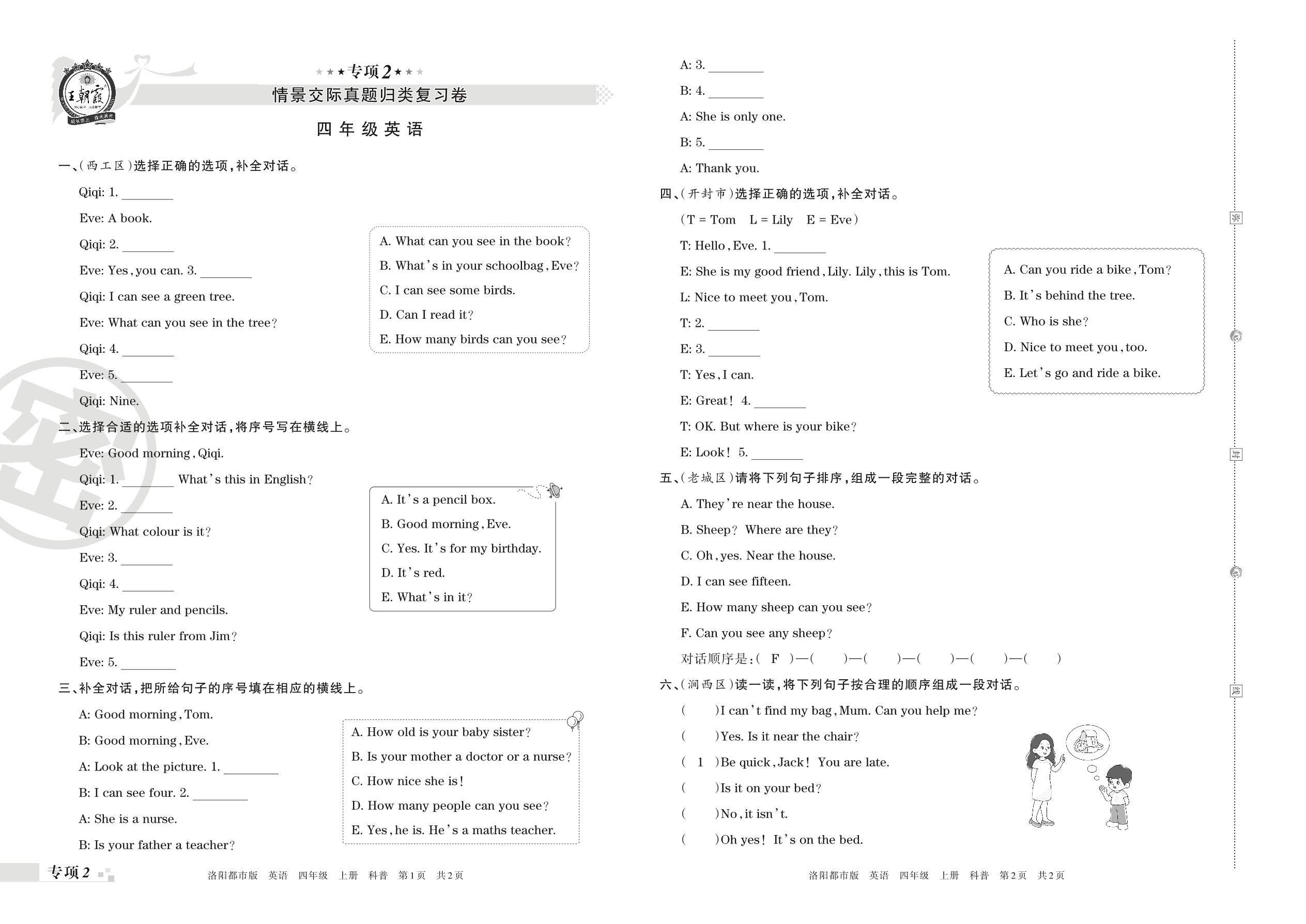 王朝霞期末专项卷——情景交际真题归类复习卷四年级上册英语(科普版)【2】