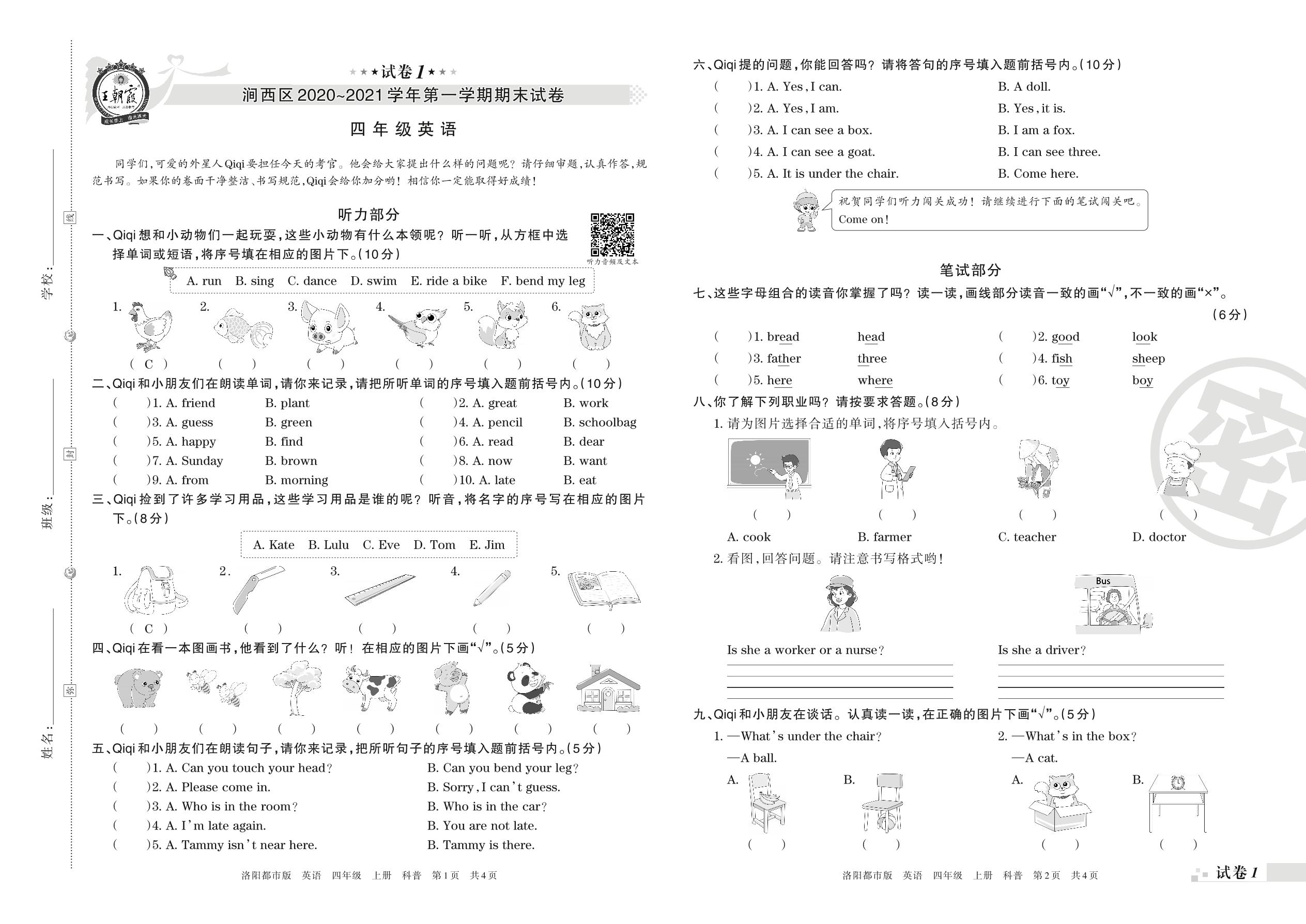 涧西区2020~2021学年第一学期期末试卷四年级英语(科普版)【1】