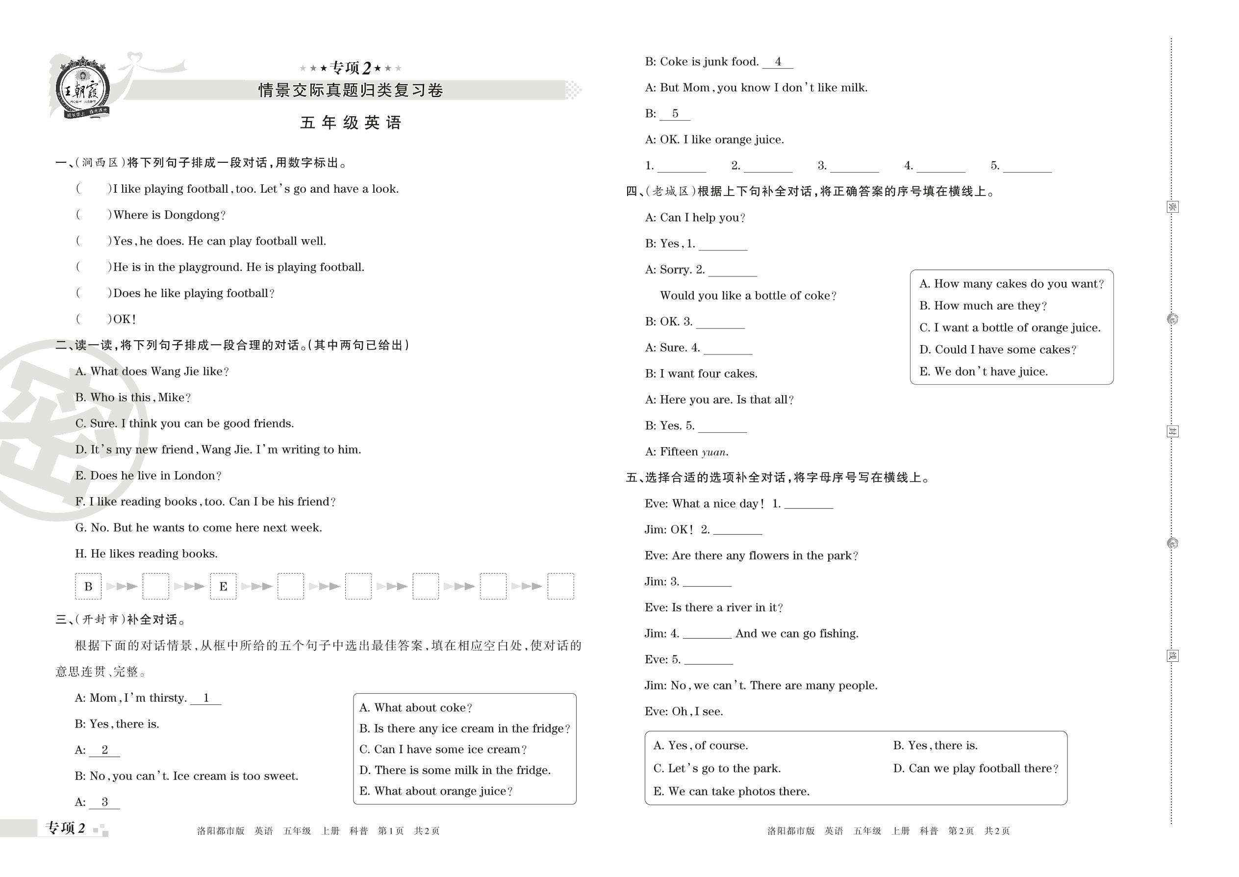 王朝霞期末专项卷——情景交际真题归类复习卷五年级上册英语(科普版)【2】