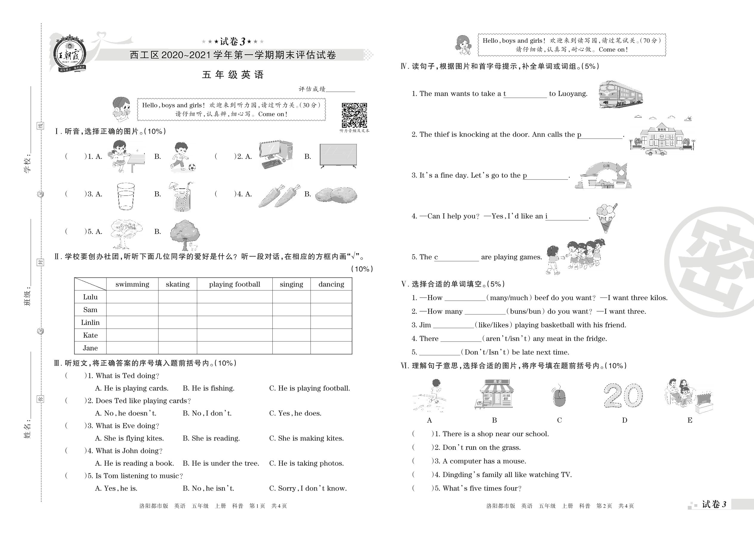 西工区2020~2021学年第一学期期末评估试卷五年级英语(科普版)【3】