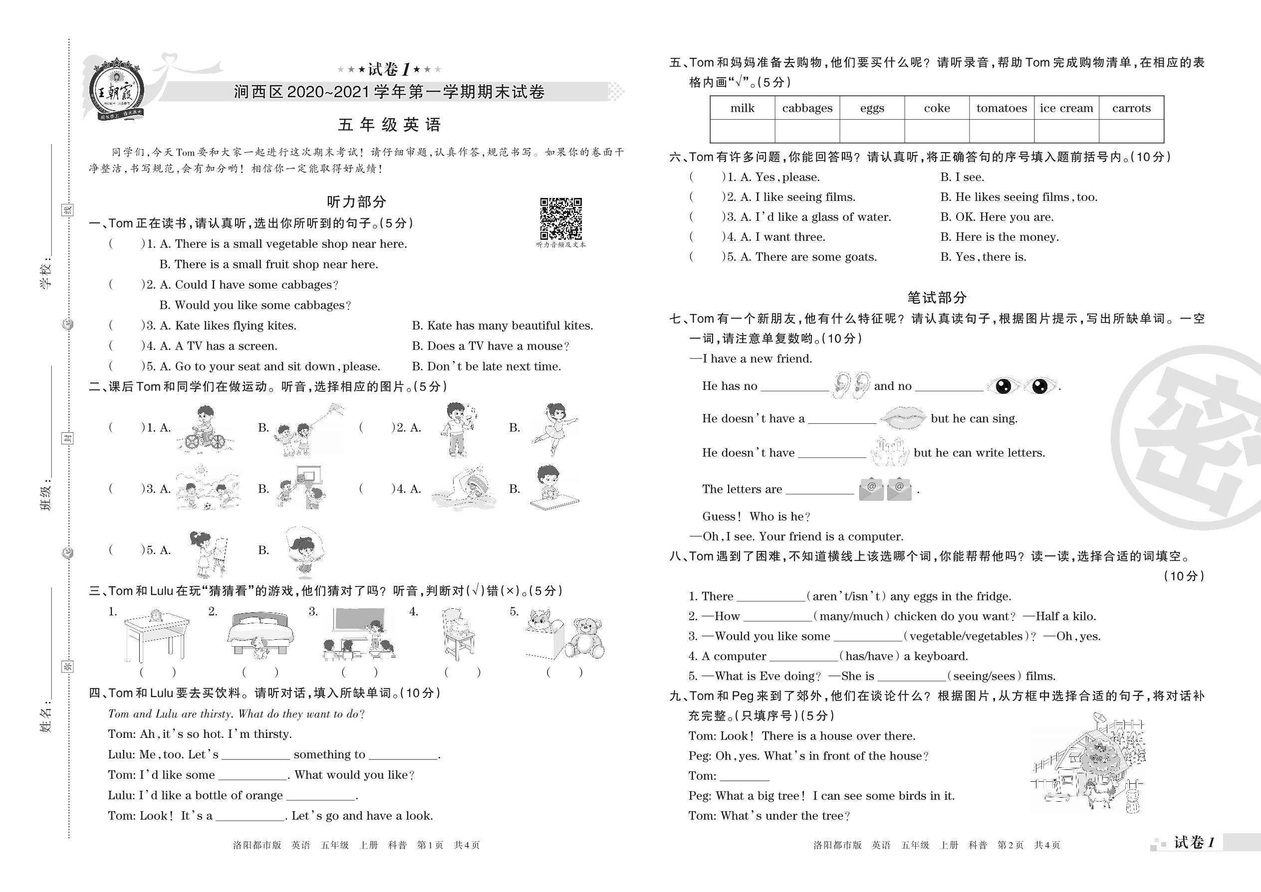涧西区2020~2021学年第一学期期末试卷五年级英语(科普版)【1】