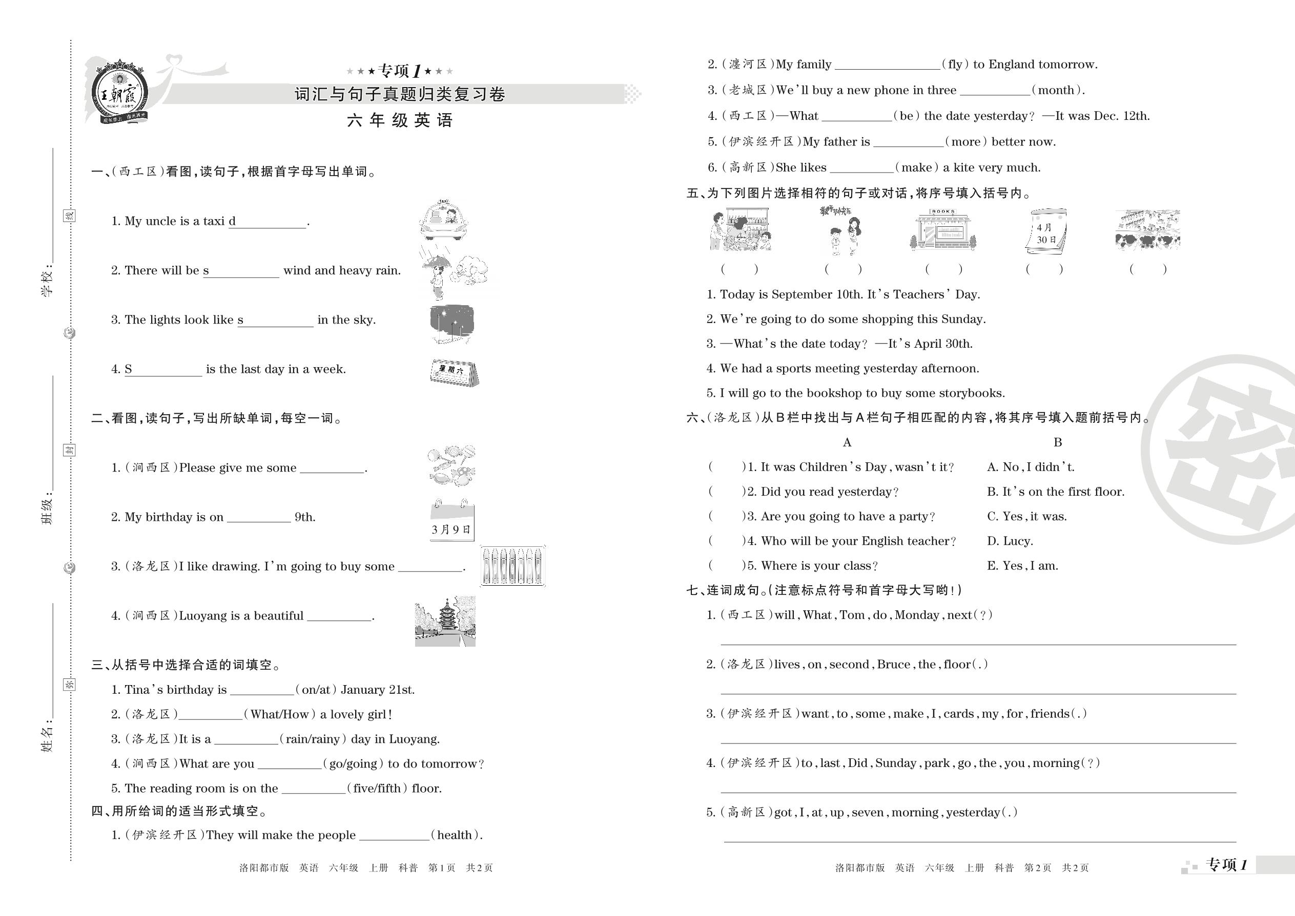 王朝霞期末专项卷——词汇与句子真题归类复习卷六年级上册英语(科普版)【1】