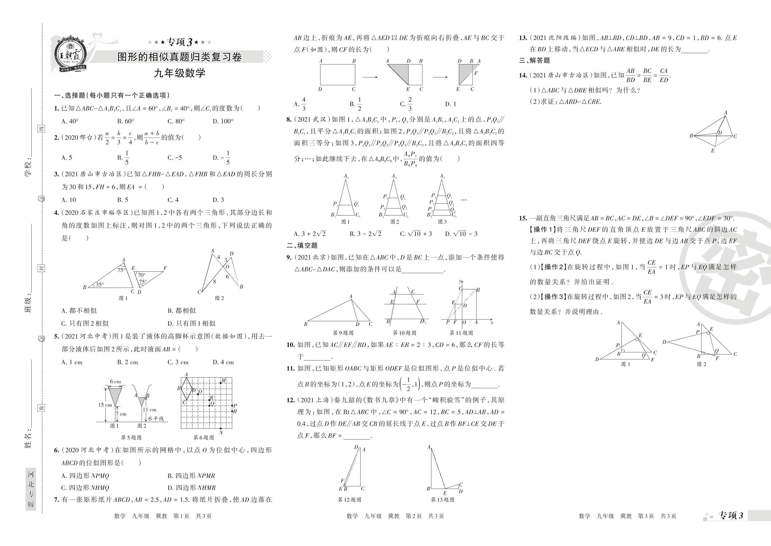 2021-2022学年第一学期王朝霞期末专项卷——图形的相似真题归类复习卷九年级数学(冀教版)【3】
