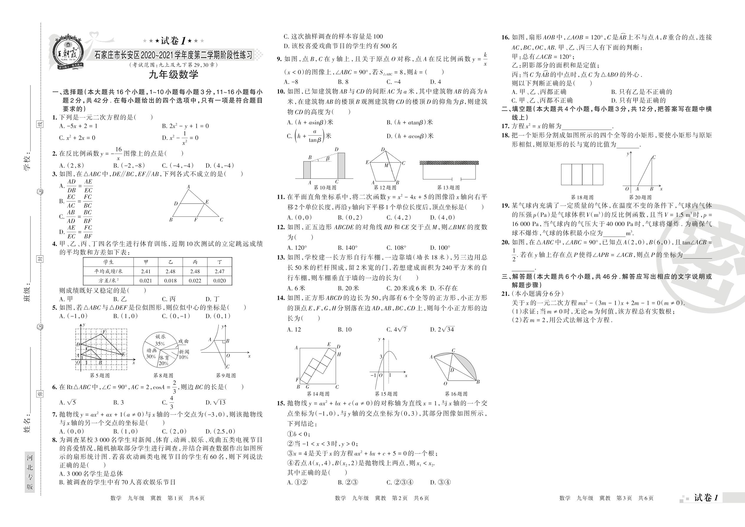 石家庄市长安区2020~2021学年度第二学期阶段性练习九年级数学(冀教版)【1】