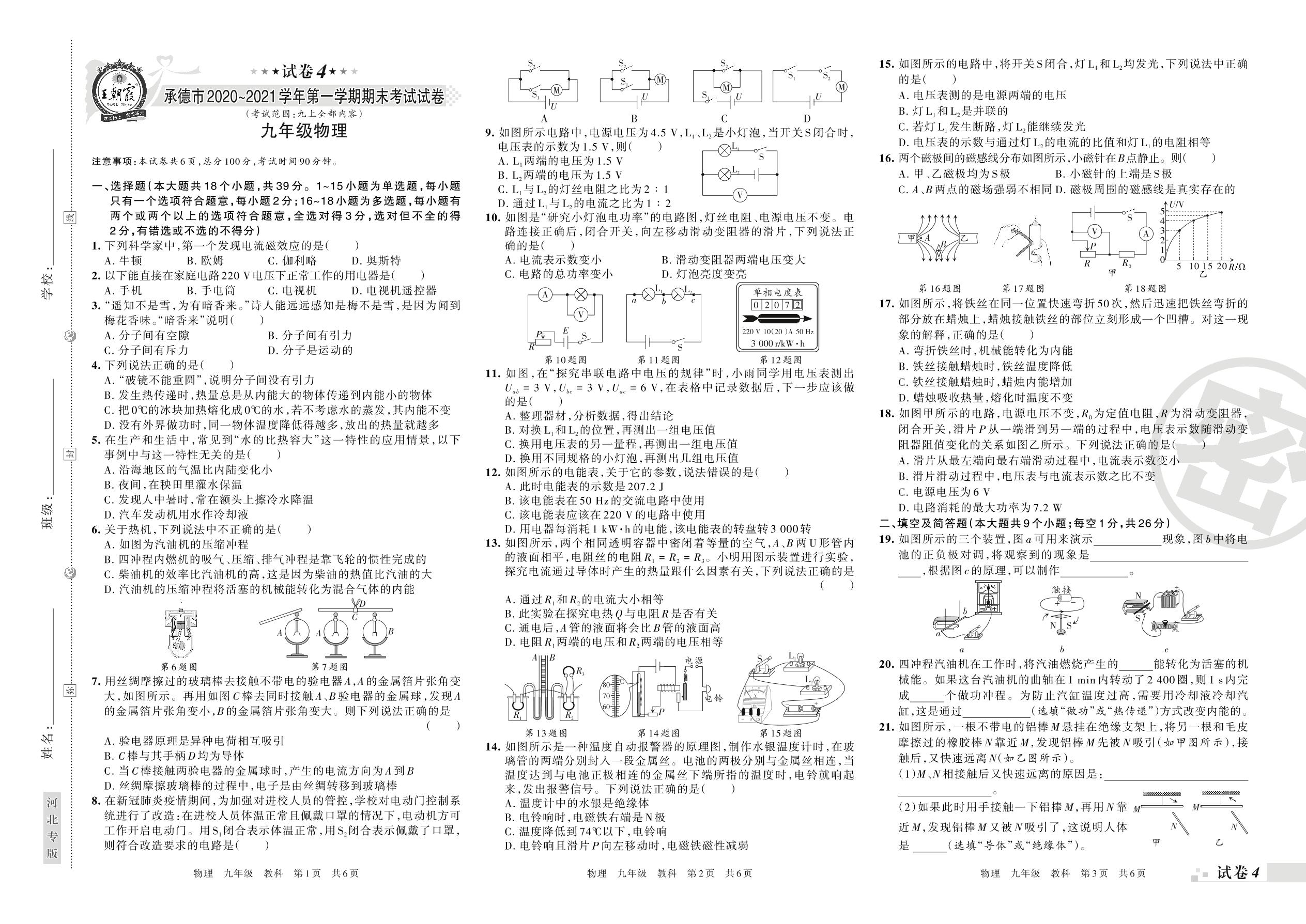 承德市2020~2021学年第一学期期末考试试卷九年级物理(教科版)【4】