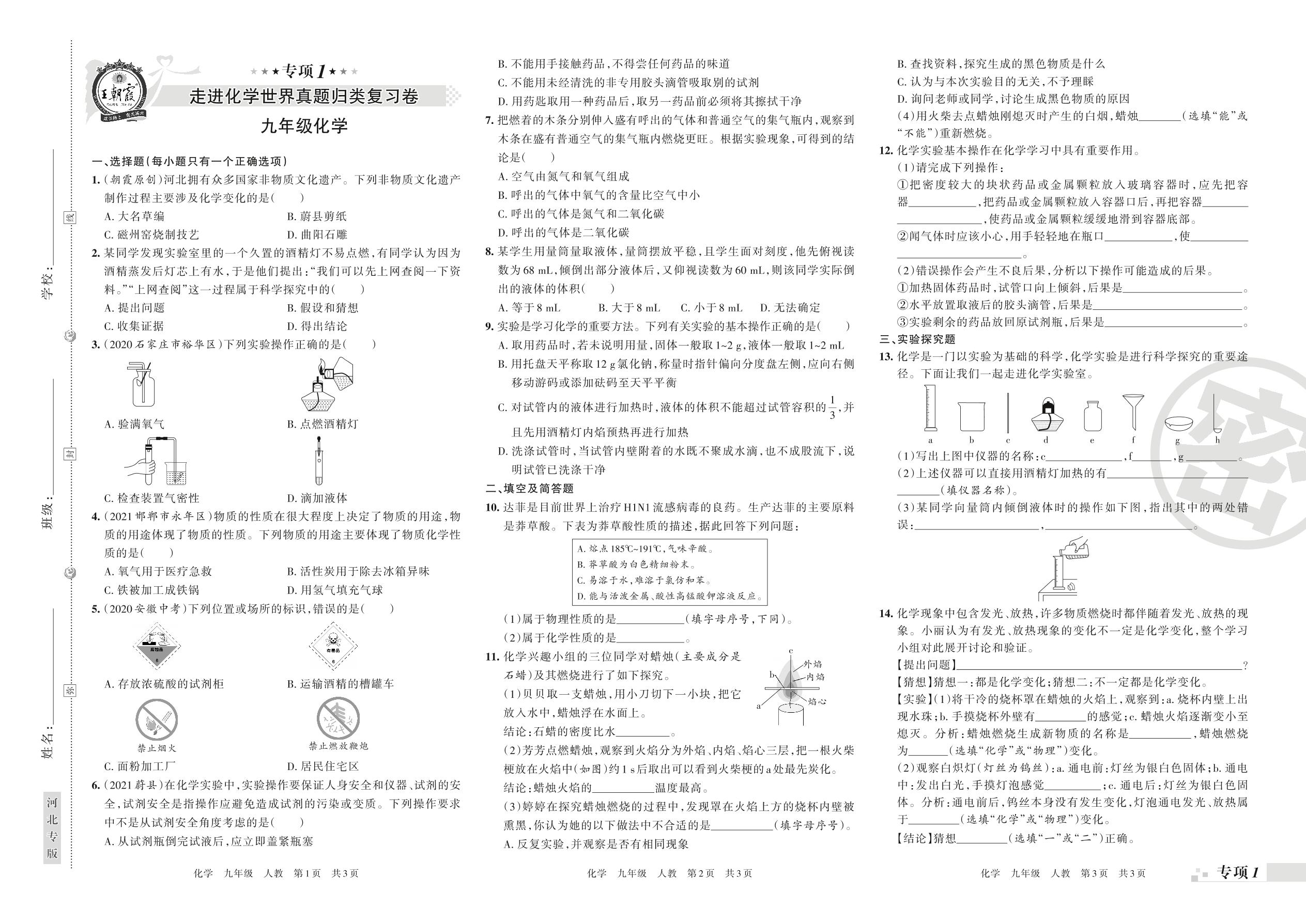 2021-2022学年第一学期王朝霞期末专项卷——走进化学世界真题归类复习卷九年级化学(人教版)【1】